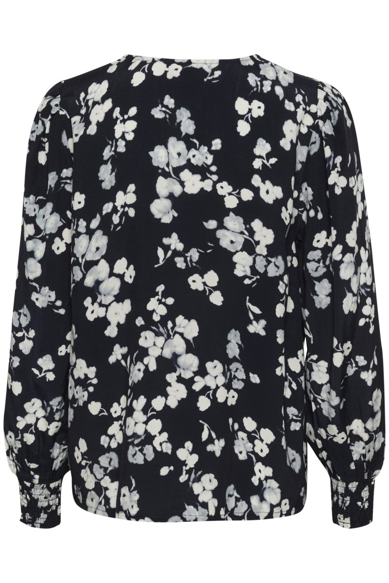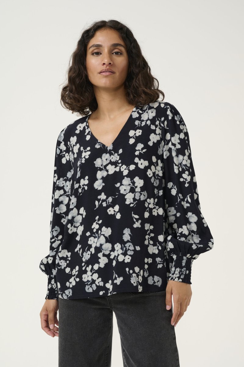 V-ringad blus med rak passform och långa, subtilt voluminösa ärmar med rynkade muddar.