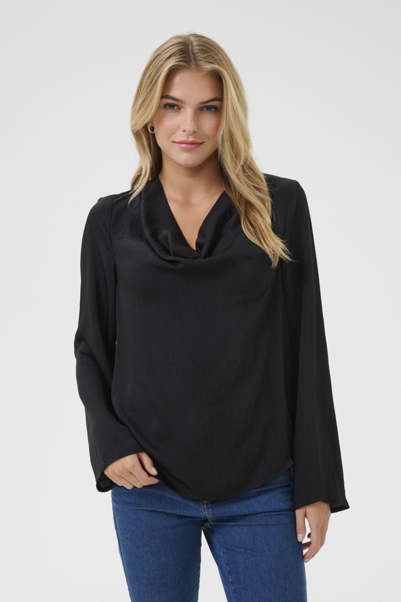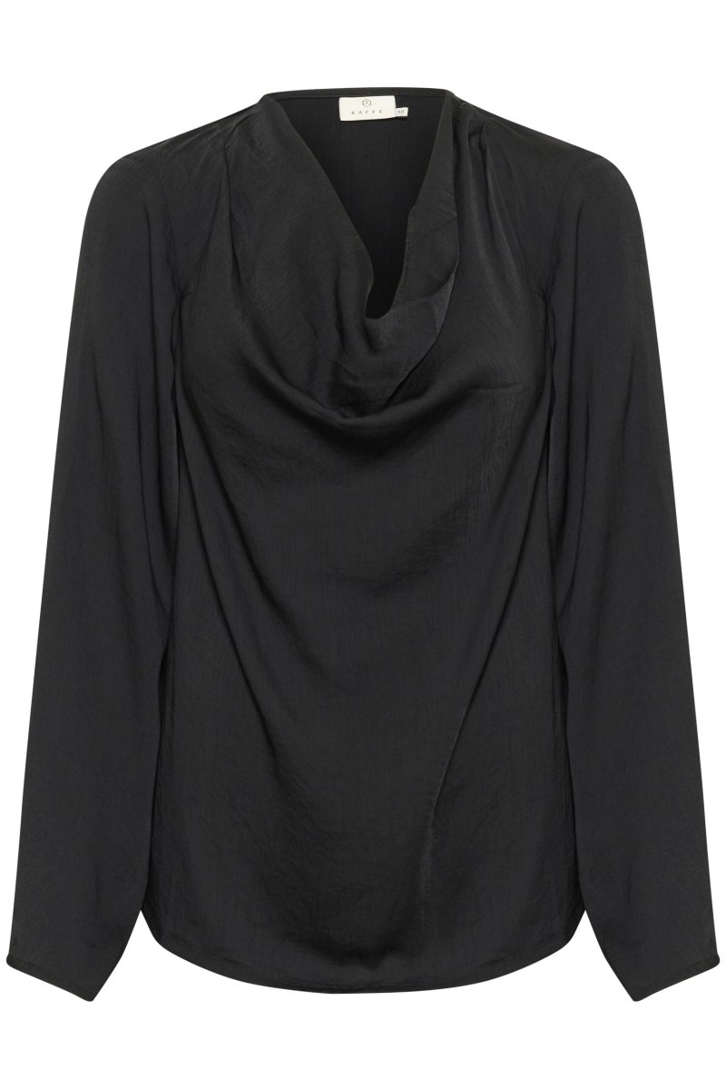 Draperade blus har en mjukt böljande textur, avslappnad passform och lång ärm.