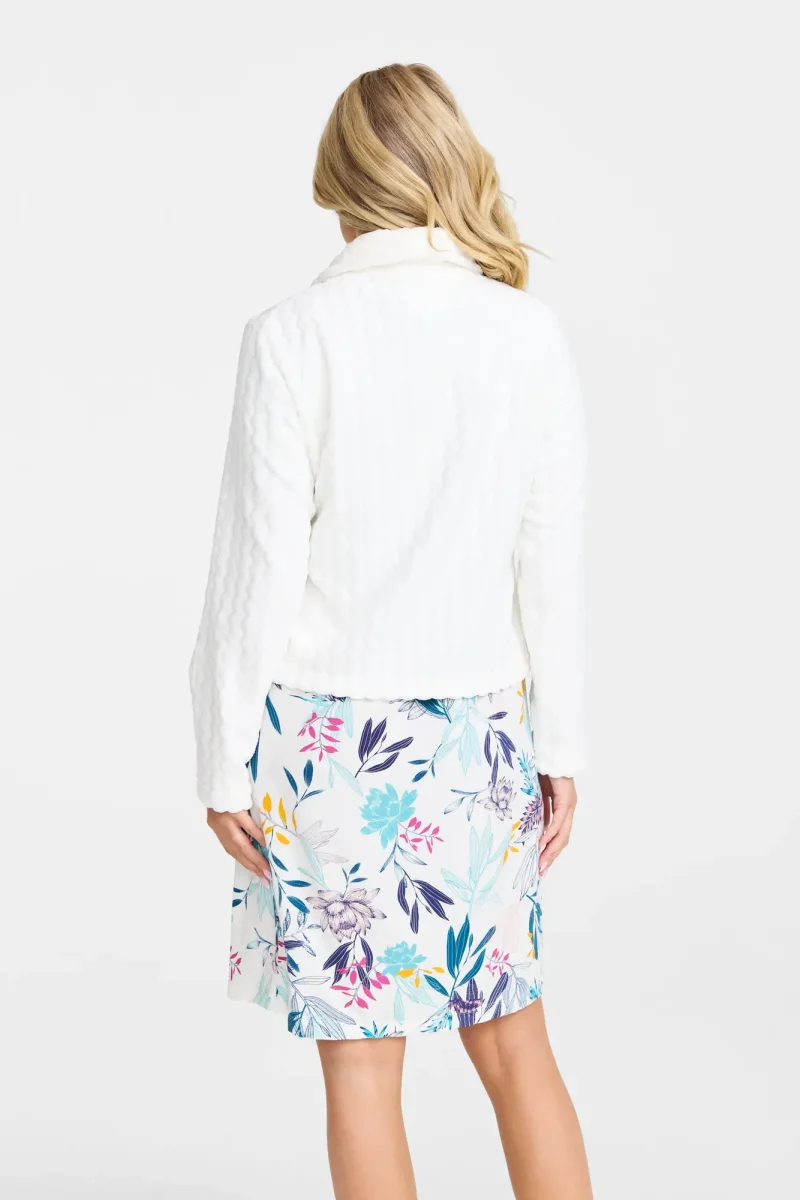 En bäddjacka i jacquardfleece med sjalkrage och en knappstängning. Varm, mysig och mångsidig, perfekt för att hålla sig bekväm under kyligare dagar både hemma och borta. Som att få en varm kram, oavsett var du befinner dig.