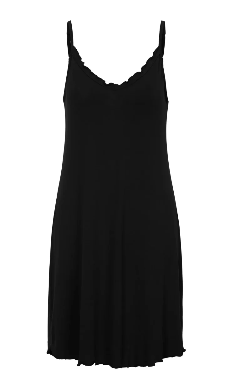 Nattlinne i bambuviskos med dekorativt vågformad kant upptill och vid fållen, tunna och justerbara axelband. Erbjuder en blandning av komfort och stil med sitt mjuka bambuviskosmaterial. Njut av en fridfull natts sömn i denna vackert designade nattklädsel.