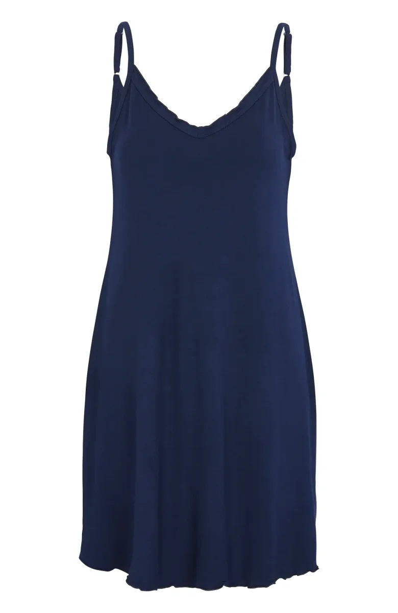Nattlinne i bambuviskos med dekorativt vågformad kant upptill och vid fållen, tunna och justerbara axelband. Erbjuder en blandning av komfort och stil med sitt mjuka bambuviskosmaterial. Njut av en fridfull natts sömn i denna vackert designade nattklädsel.