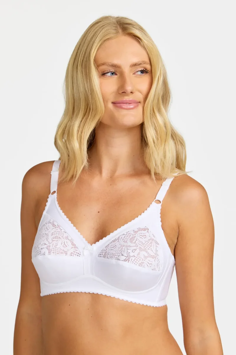 Henny är en BH utan bygel och vaddering som erbjuder både komfort och elegans, smyckad med vacker spets upptill. De justerbara axelbanden är placerade framtill, vilket gör det enkelt att anpassa passformen för optimalt stöd. Den breda ryggen ger extra stöd och bidrar till att fördela vikten jämnt över bålen. En liten rosettdetalj framtill ger en feminin touch. Den är tillverkad i Europa och kombinerar funktion med en naturlig känsla.