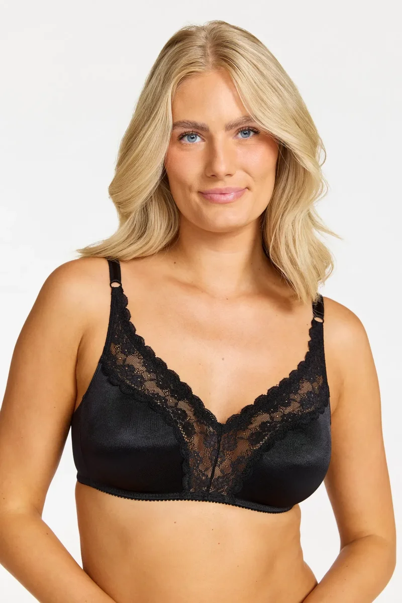 Upplev både komfort och elegans med denna mjuka BH utan bygel, med formpressade kupor och ett skimmrande tyg. Genomskinliga spetsdetaljer som löper från framdelen upp till de justerbara axelbanden ger en sofistikerad och feminin touch. Helt bygellös för maximal komfort hela dagen. Från kupa D och uppåt har modellen bredare axelband och tre hyskor i ryggen för extra stöd och stabilitet. En mångsidig BH som passar lika bra till festligare tillfällen som för vardagsbruk.