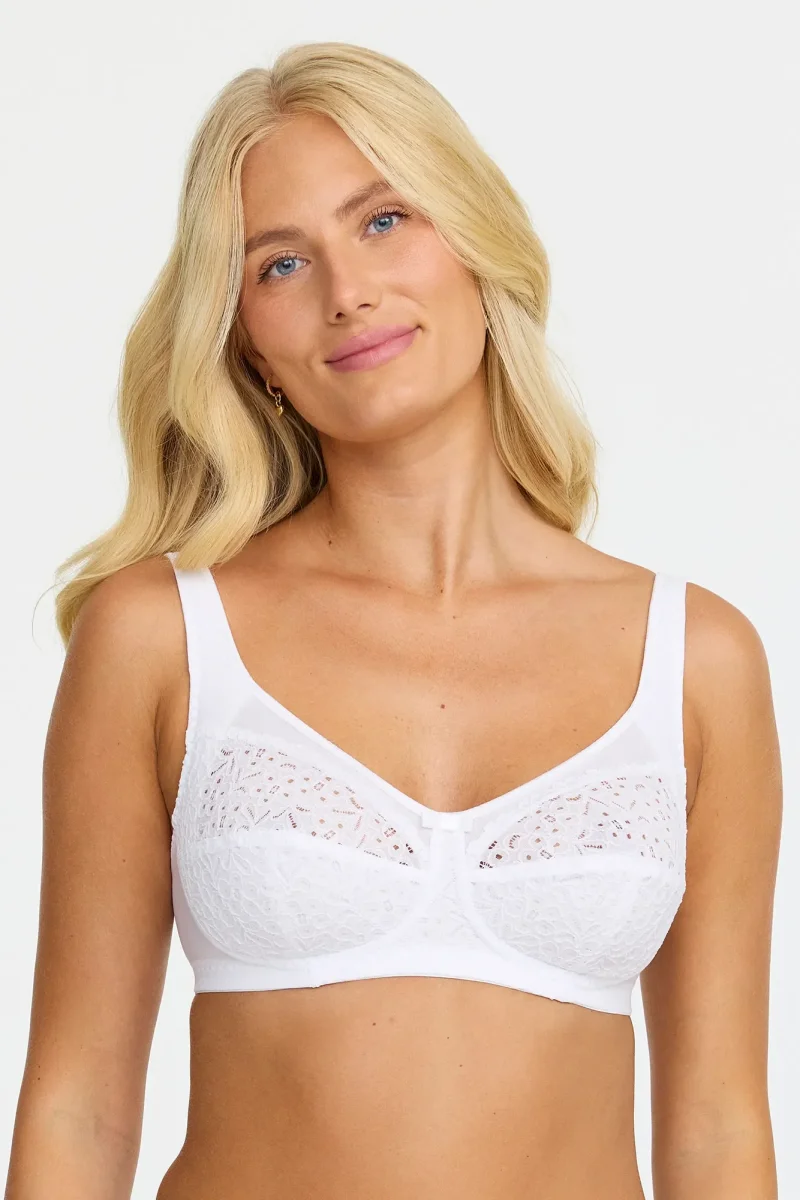 Upptäck en ny nivå av komfort och stil med vår bygellösa BH Viola, som pryds av eleganta spetsdetaljer framtill. De justerbara axelbanden gör det enkelt att anpassa passformen efter dina behov. En liten rosettdetalj framtill ger en feminin touch, samtidigt som BH:n ger ett fint lyft och formar bysten rundat och naturligt. Viola är perfekt för vardagen, men fungerar också väl vid festligare tillfällen. Tillverkad i Europa.