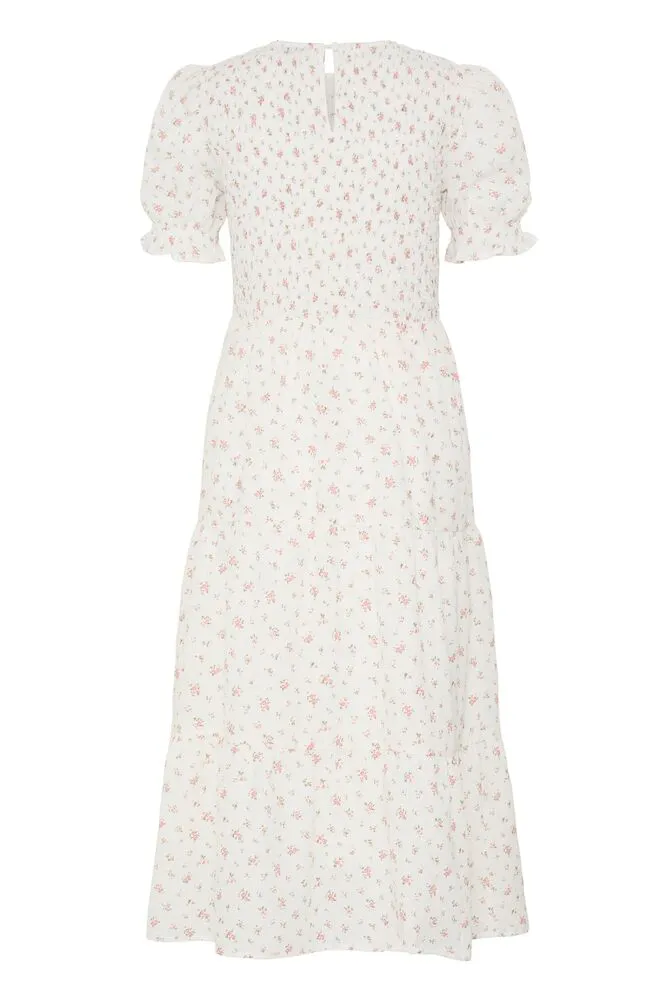 Blommig klänning med smock och puffärm. Färg: White/Pink Material: 50% Bomull 50% Polyester
