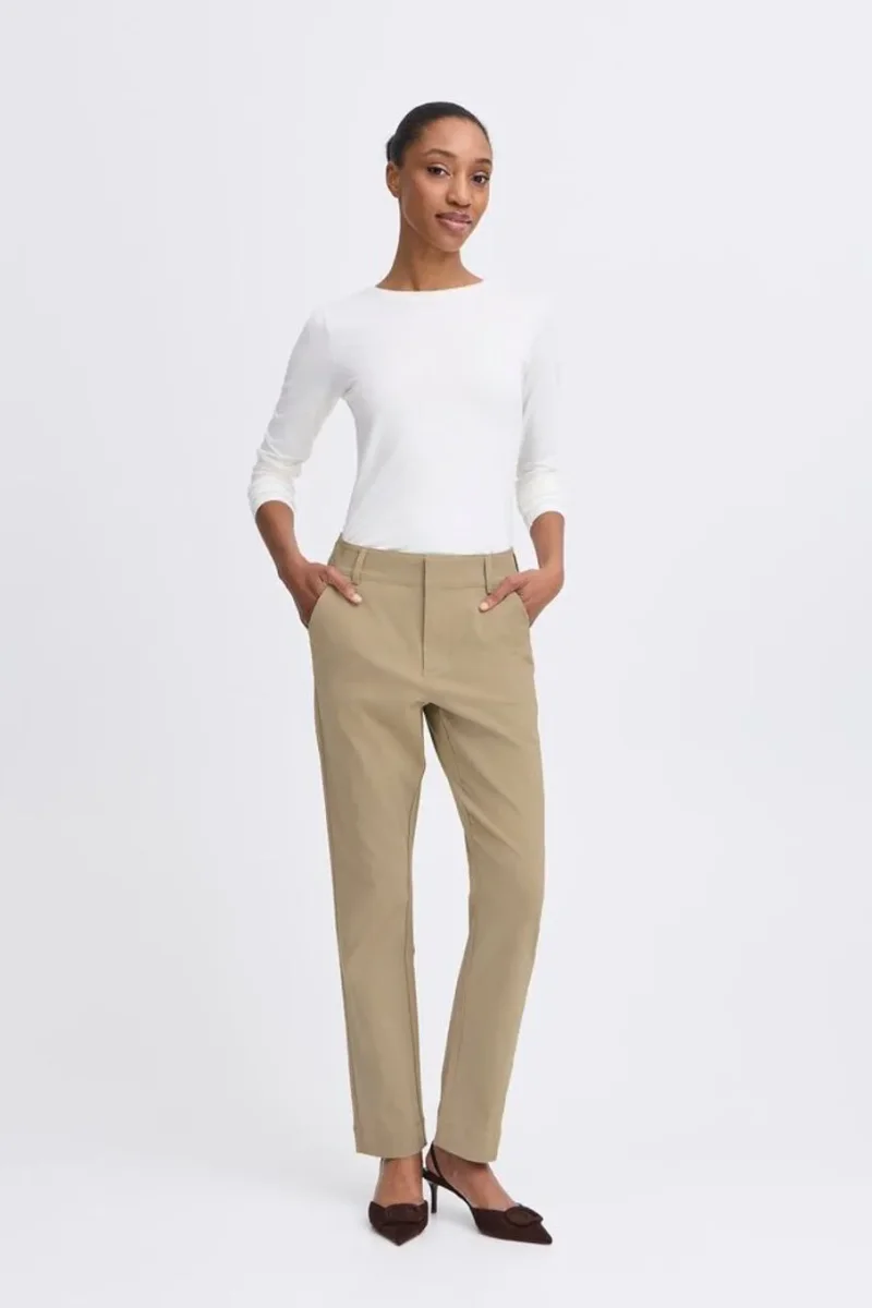 Stretchig byxa med raka ben, sidofickor fram och fuskfickor bak. Färg: Chinchilla Material: 75% Viskos 21% Polyamid 4% Elastan