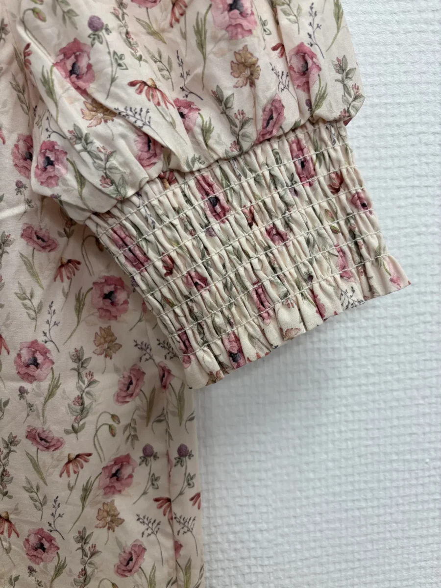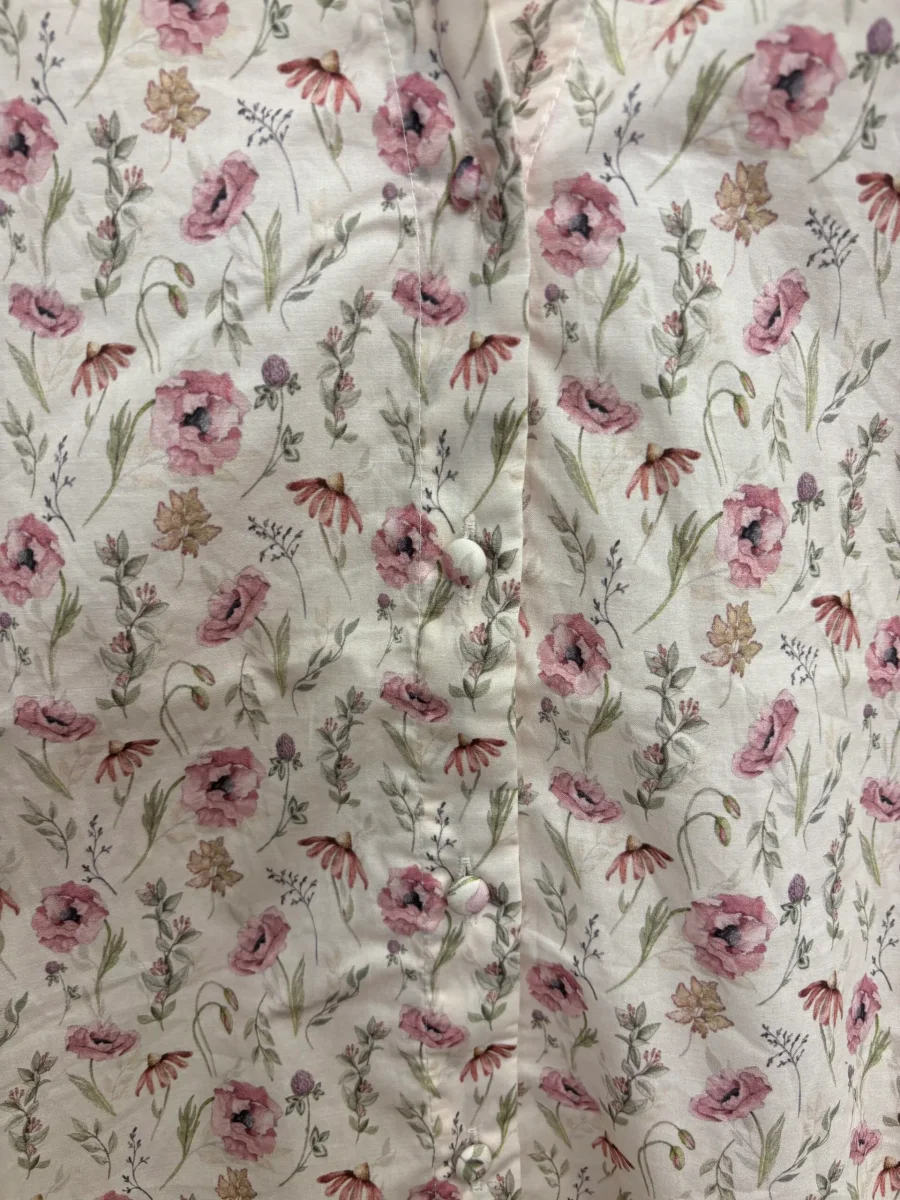 Vävd bomullstop med v-ringning och volang, ärm med smock nedtill. Färg: Pink wildflower Material: 100% Bomull