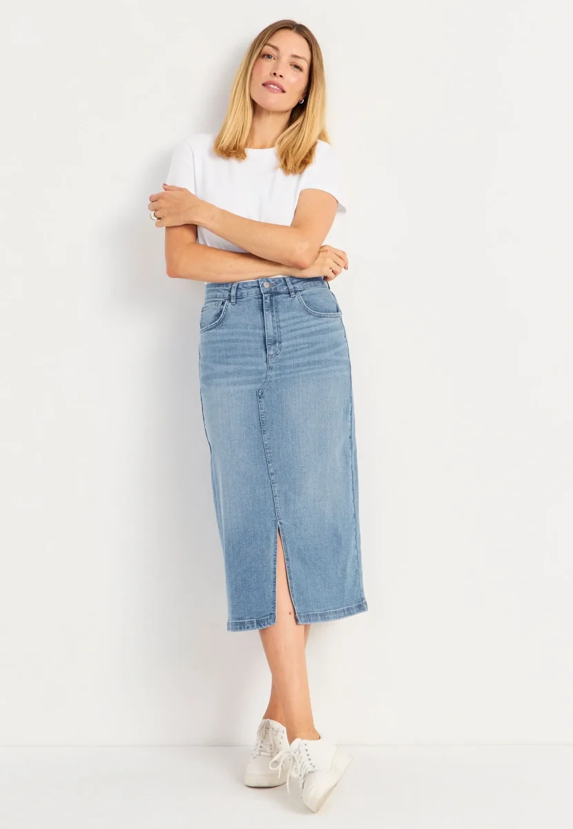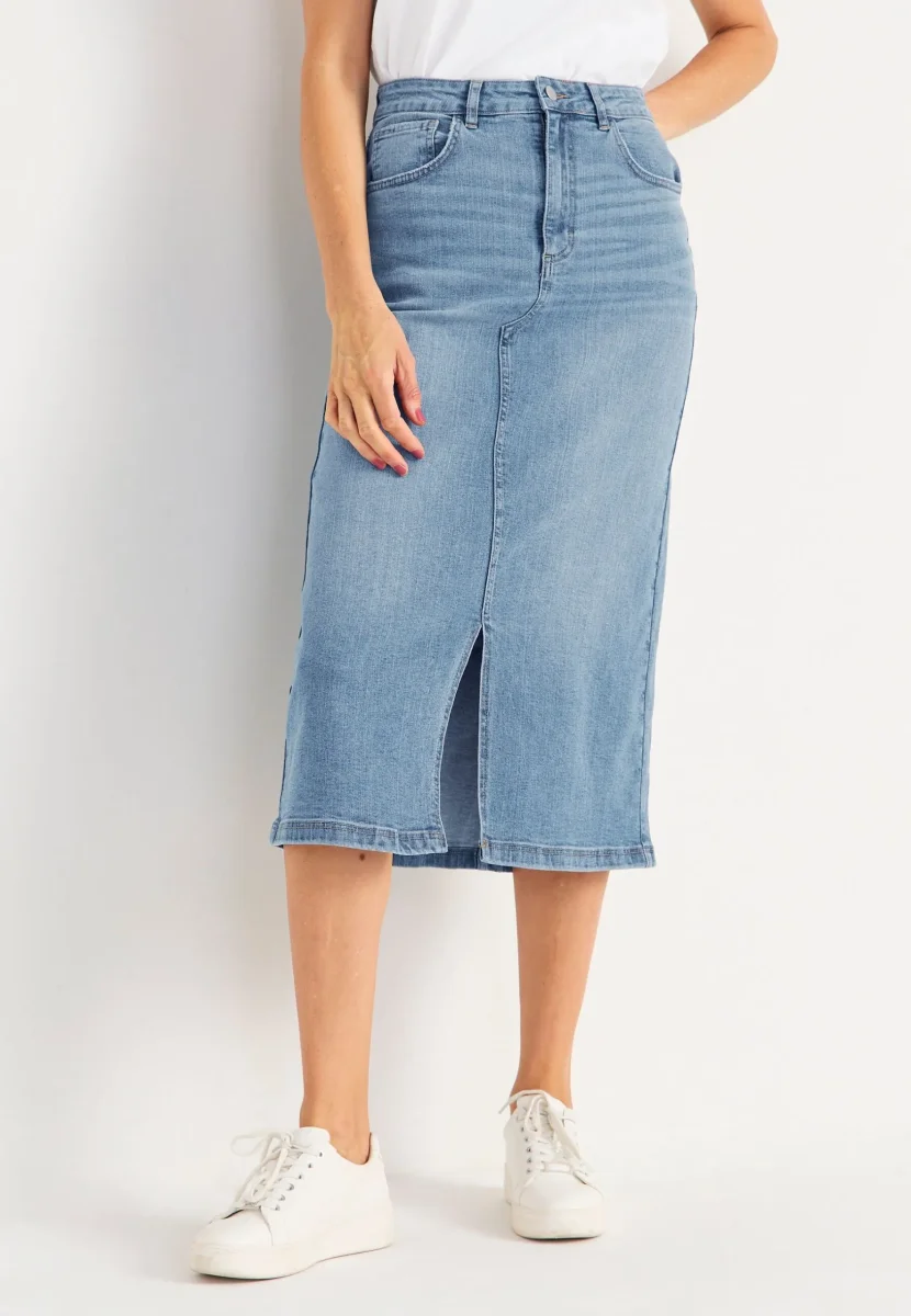Bekväm kjol i mjuk, stretchig kvalité. 5-ficksdesign med normal midja och dragkedjegylf. Rak modell. Ok bak och hällor i midjan. Längden följer storleken ca 83 cm. Färg : Light Blue Denim Material: 98% Bomull 5% Elastan