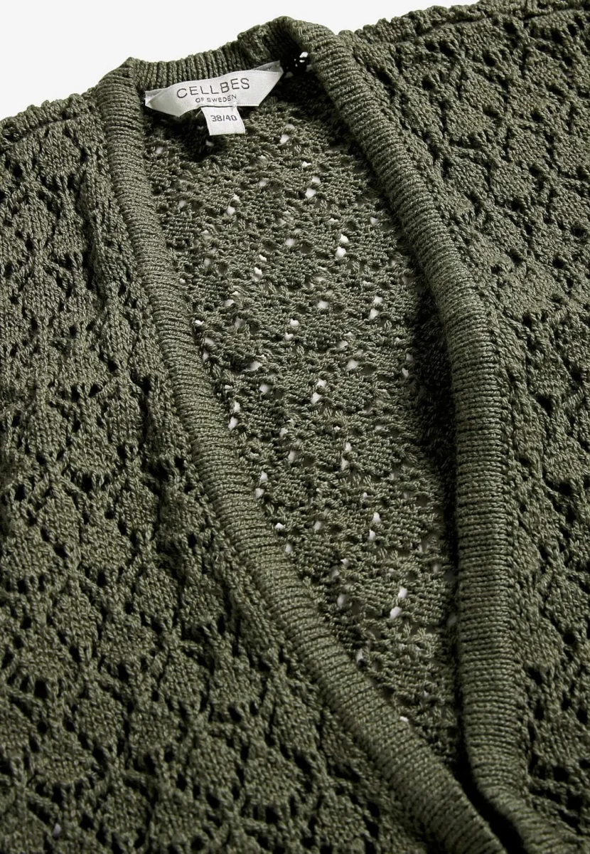 Mjuk, luftig cardigan med spetsliknande finstickning i öppen rak modell med dold knapp. Ledig, rak passform. Längden följer storleken ca 79-86 cm från axeln. Färg: Grön Material: 60% bomull 40% polyester av återvunnen fiber