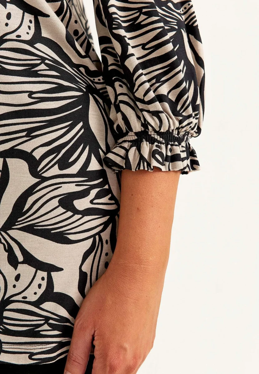 Trikåtunika med smockdetalj i ärmslutet. 3/4 lång ärm. Rund hals, rak nederkant.