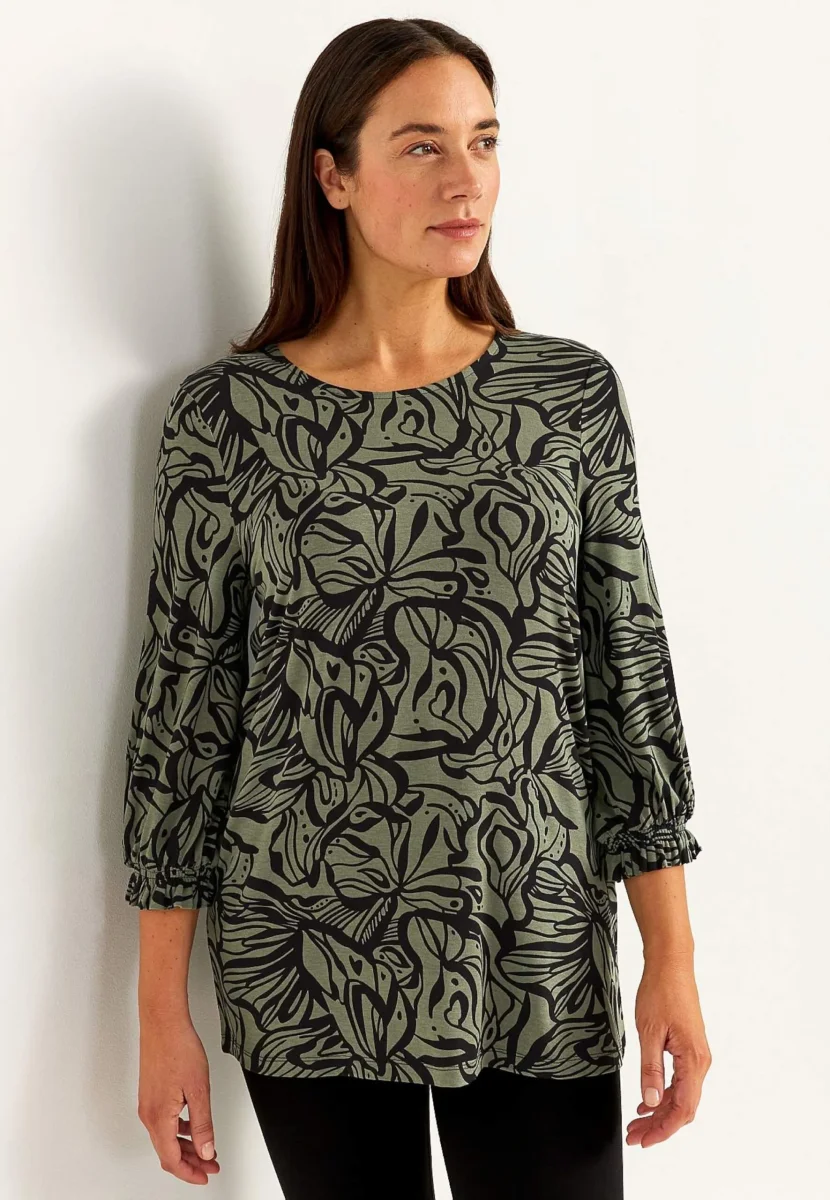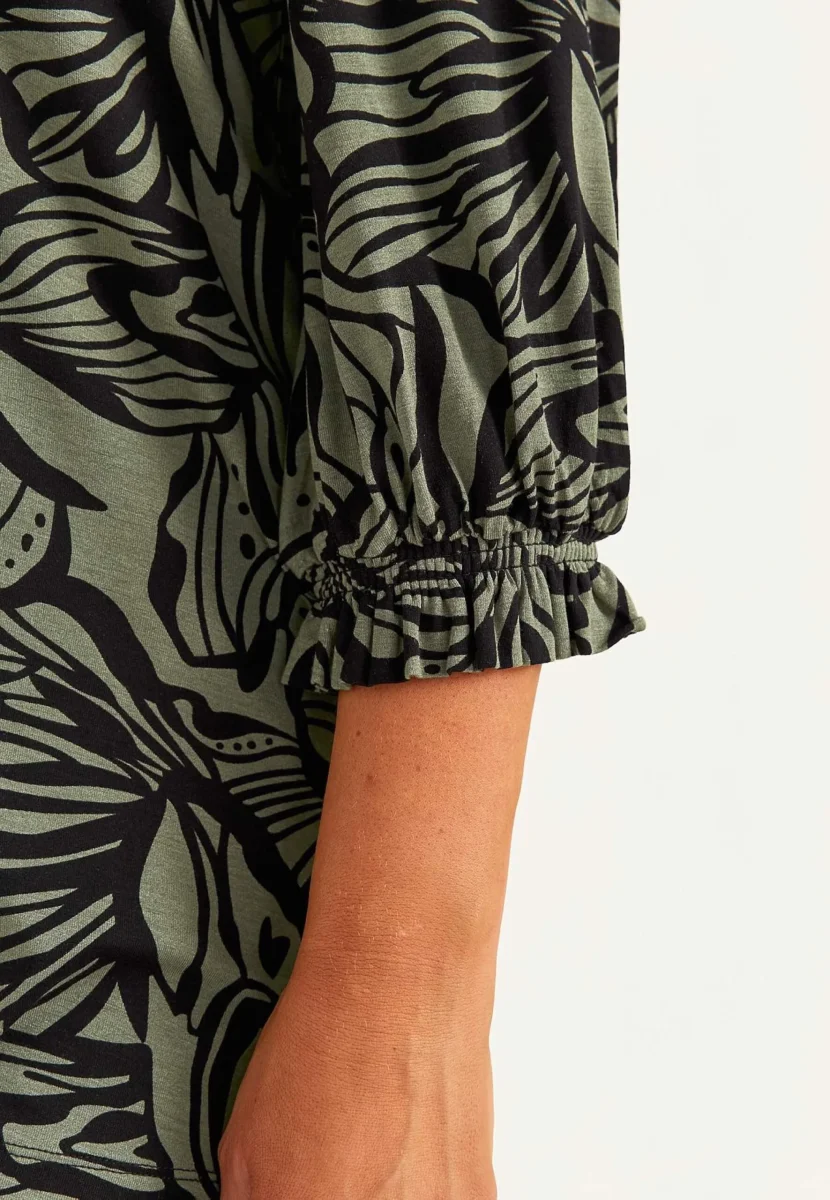 Trikåtunika med smockdetalj i ärmslutet. 3/4 lång ärm. Rund hals, rak nederkant.