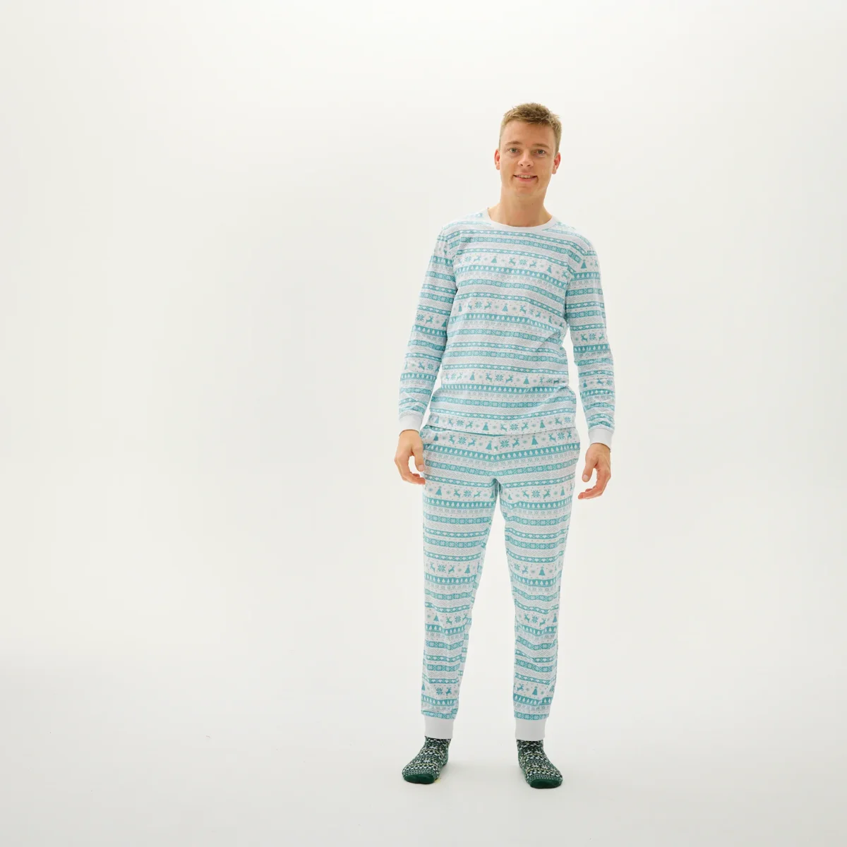 Den här mönstrade ljusblå pyjamasen blir svår att missa i jul. Köp den före din bästavän!