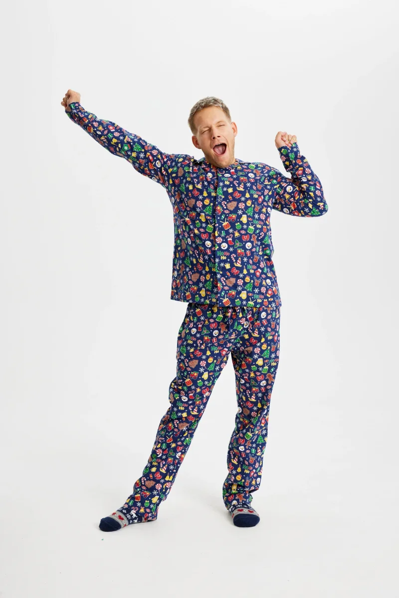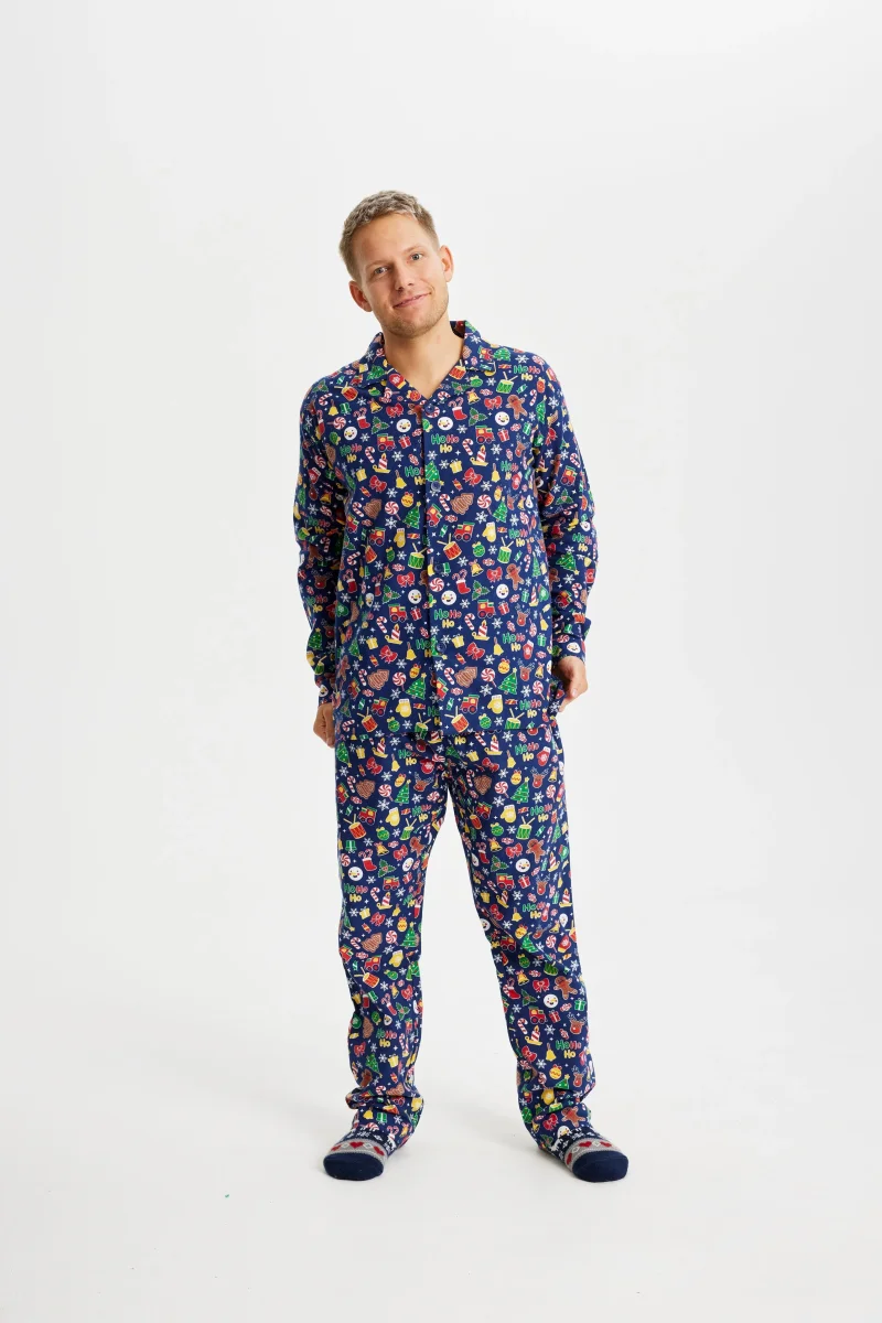 Dessa julpyjamasar kommer i en blandning av färger, med huvudfärgen marinblå.