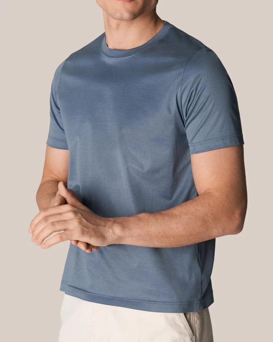 Eton Crewneck T-Shirt är en lyxig tolkning av den klassiska t-shirten, tillverkad i Portugal i en exklusiv blandning av siden och bomull som ger en mjuk, lätt och elegant känsla. Den sofistikerade materialkombinationen skapar en naturlig lyster och hög komfort samtidigt som den rena designen gör t-shirten enkel att bära både under kavaj eller som ett stilrent basplagg till vardags. Med sin tidlösa crewneck-krage, premiumkvalitet och Etons välkända hantverk är detta en t-shirt som kombinerar minimalistisk stil med lyxig komfort.