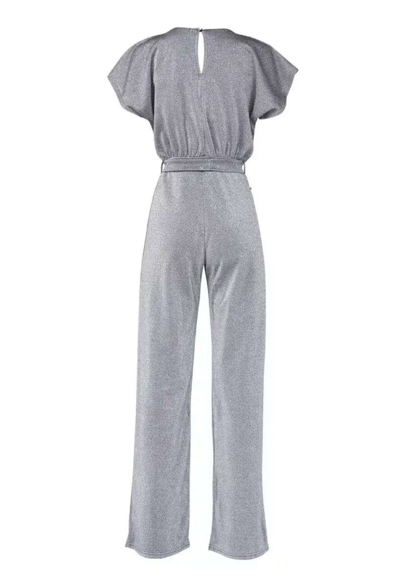 V-ringad jumpsuit med korta ärmar, smala guldränder och snörning i midjan.