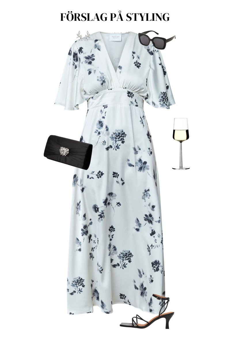 Långklänning med korta vida ärmar och v-ringning med omlottdetalj och resår i midjan bak.