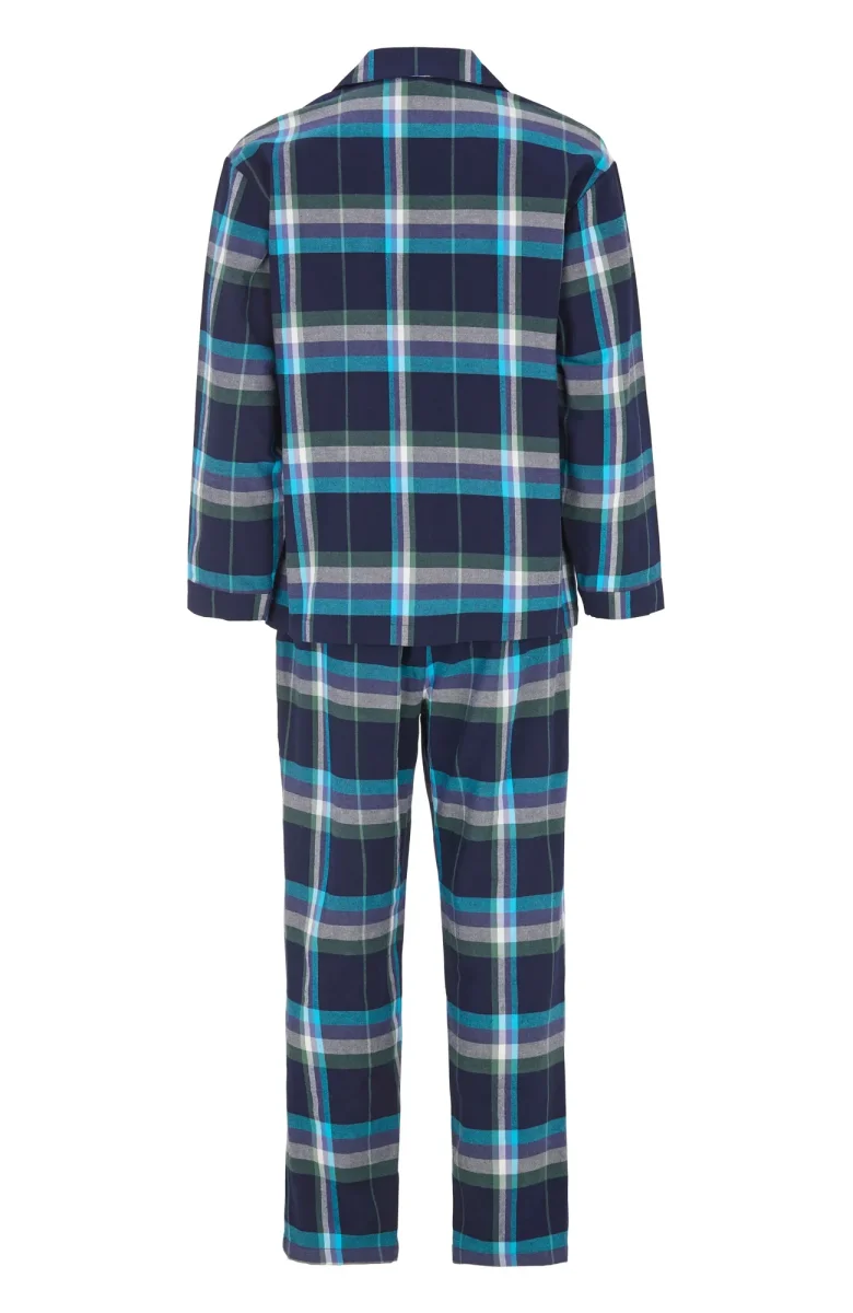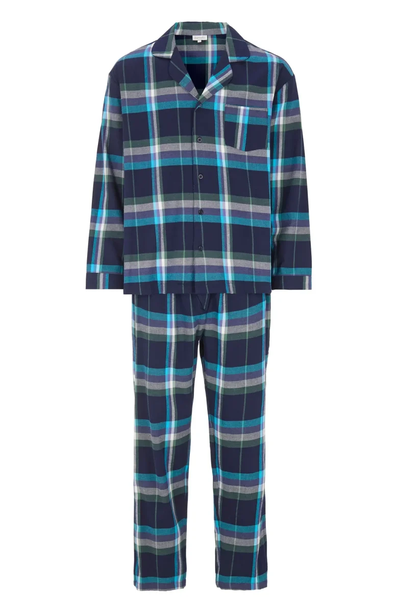 Denna herrpyjamas har en klassisk krage, praktisk knäppning framtill och långa ärmar för en tidlös look. Den långa byxan är försedd med en elastisk resår i midjan för bekväm passform och rörelsefrihet.