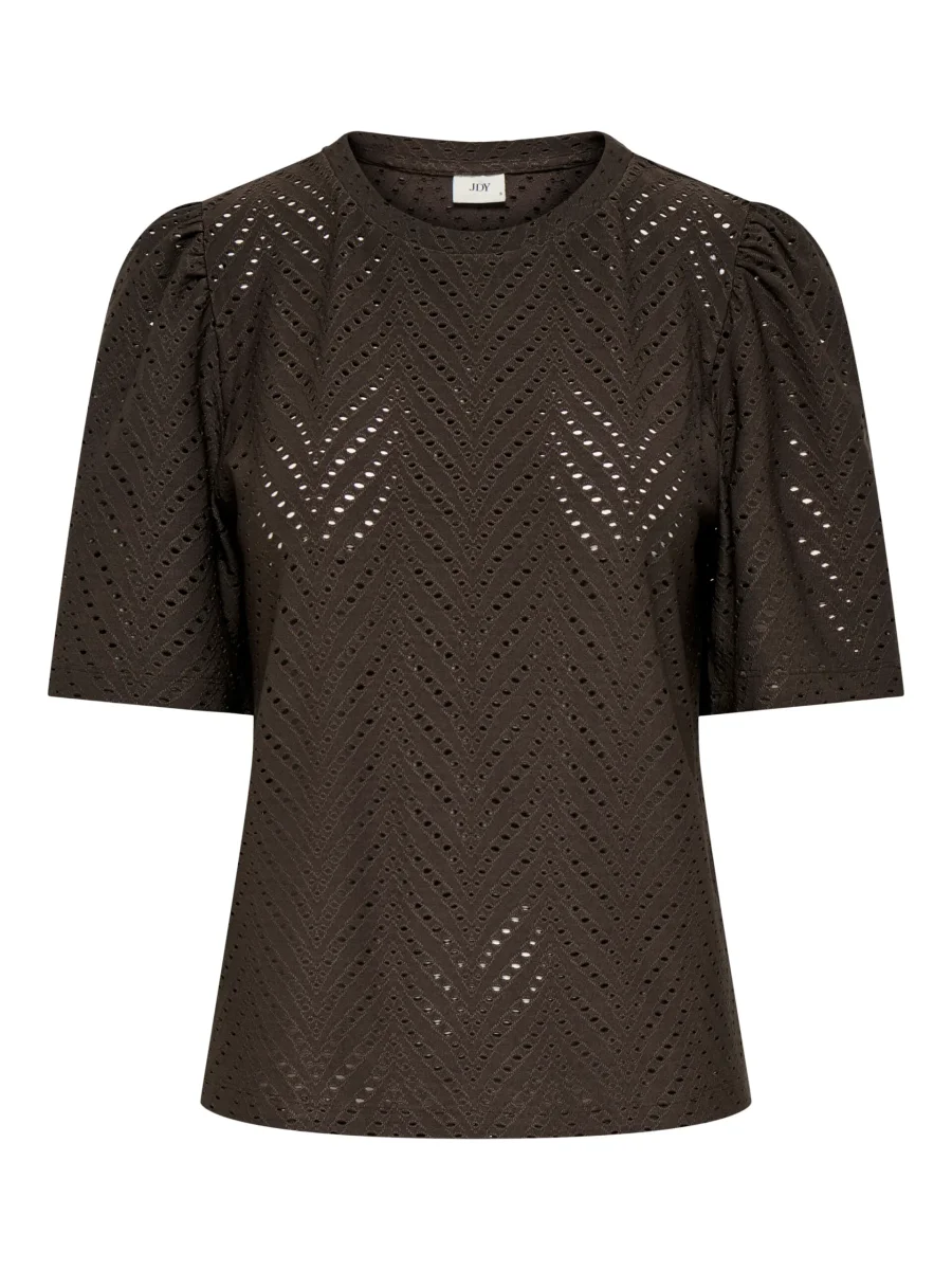 Rundhalsad hålmönstrad topp i stretchigt material kort vid ärm med puffdetalj. Färg: Chocolate Brown Material: 95% Polyester, 5% Elastan
