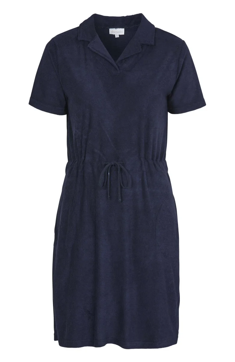 Klänning i bambu stretchfrotté med kort ärm. Klänningen har krage, dragsko i midjan samt fickor i sidan. Perfekt att ha på stranden.