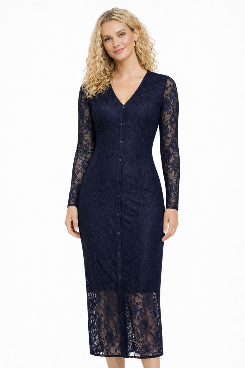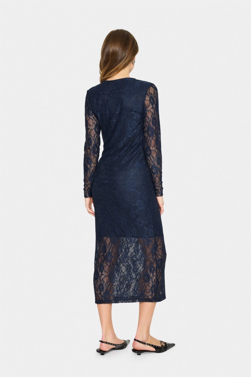 Mörkblå spetsklänning med långa ärmar och midilängd.