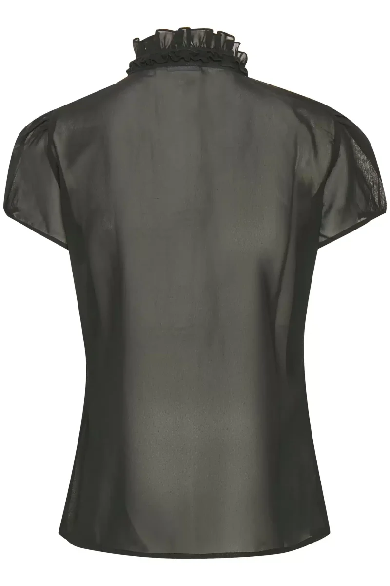 Volangblus i meshkvalitet som stängs med knappar längst framsidan, något figursydd modell med liten ryschprydd hals och påsydda volanger på bröstet. Korta ärmar med elastiskt ärmslut. Gjord i semitransparent chiffong.