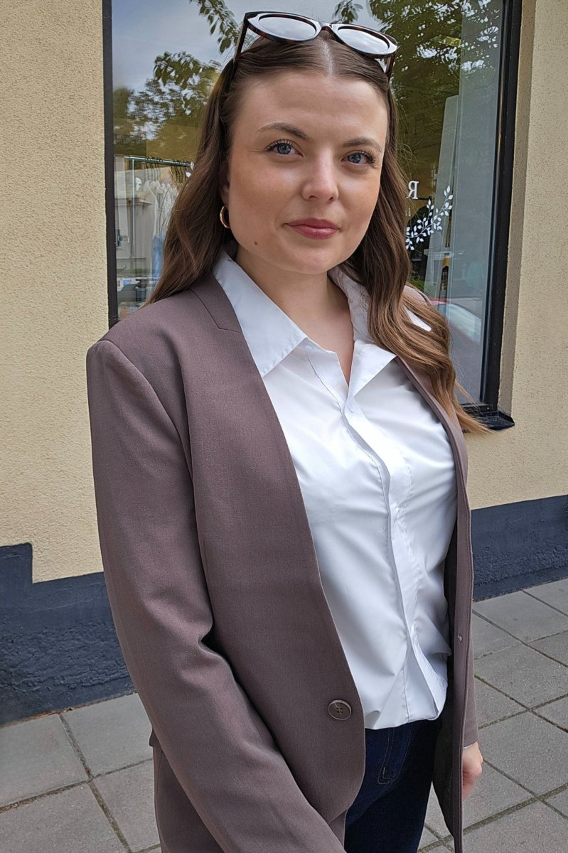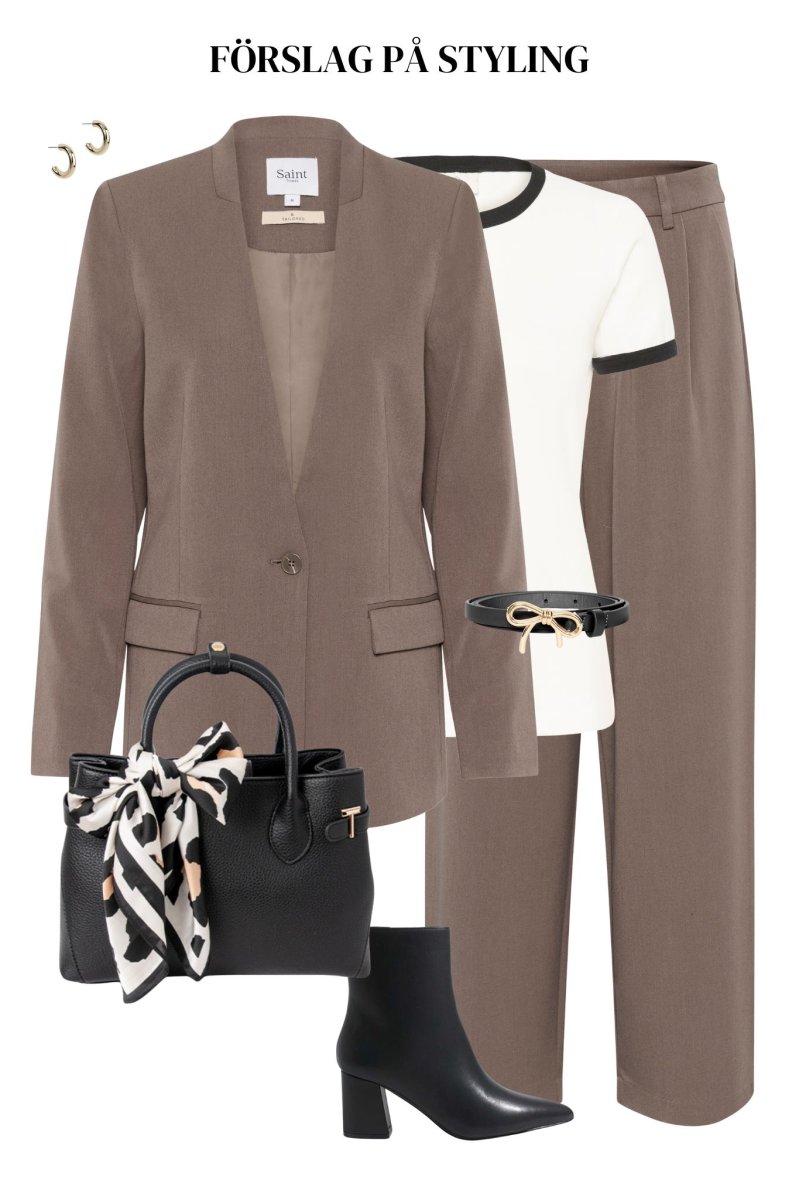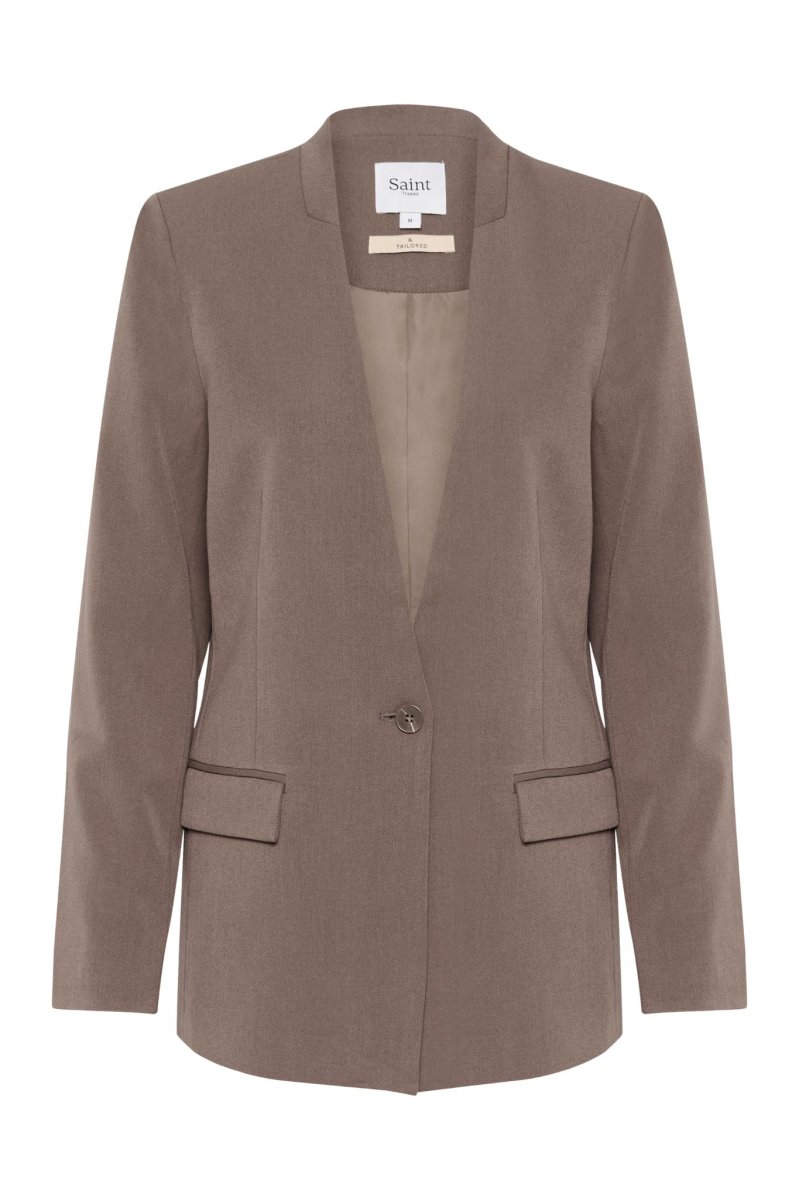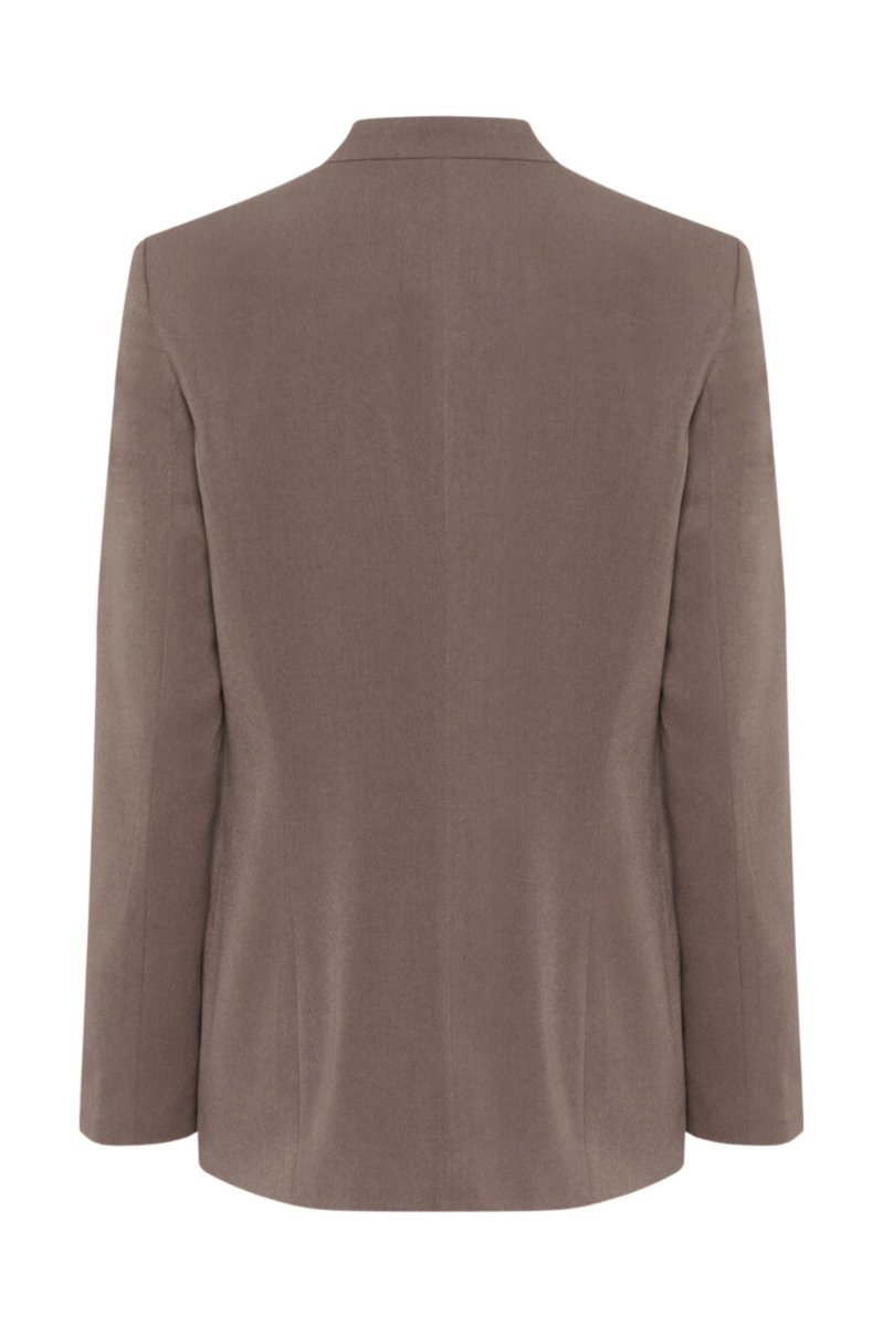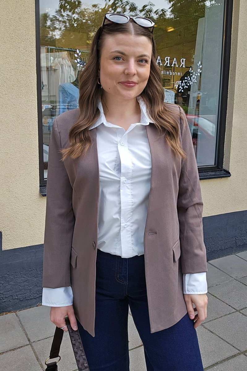 Skräddarsydd kavaj i varmbrun med enkel knäppning och markerade axlar.