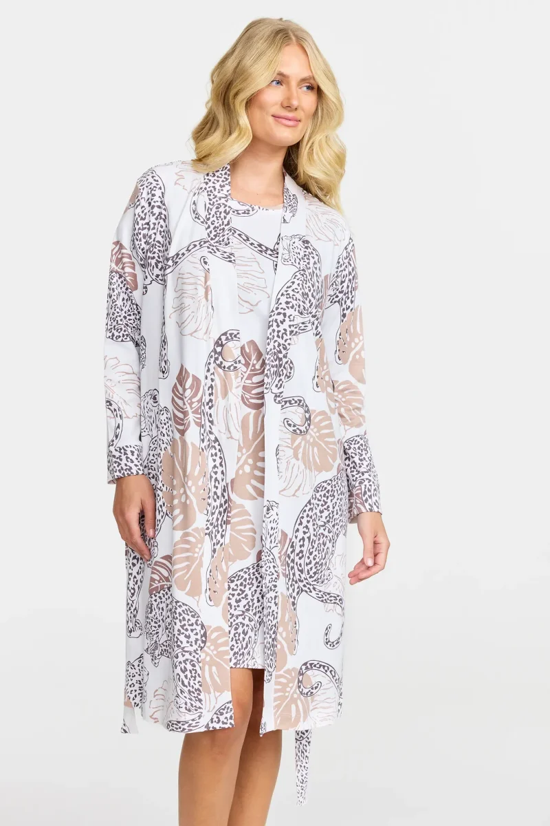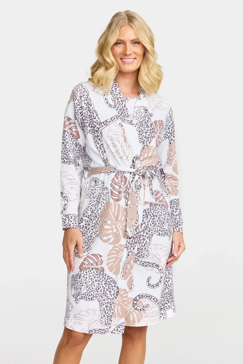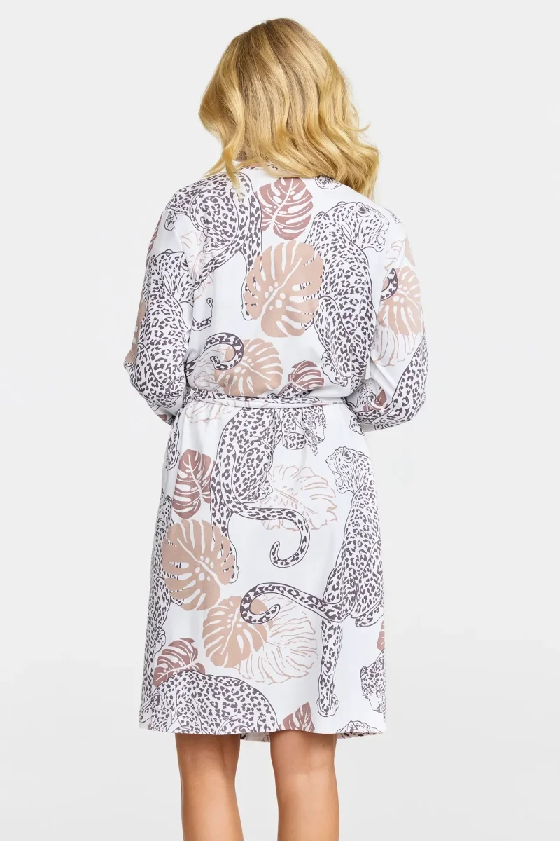 Denna omlottrock i mönstrad jersey är tillverkad av en lyxig blandning av bomull och modal, vilket ger en exceptionell mjukhet och komfort. Det lätta, tryckta tyget har en stilren design och kombinerar den silkeslena känslan av modal med bomullens hållbarhet. Den eleganta omlottstilen ger en smickrande passform och skön komfort, vilket gör den perfekt för avkoppling hemma.