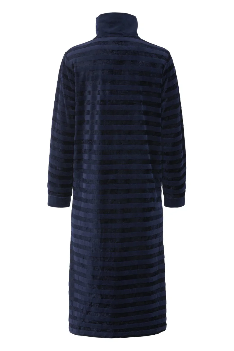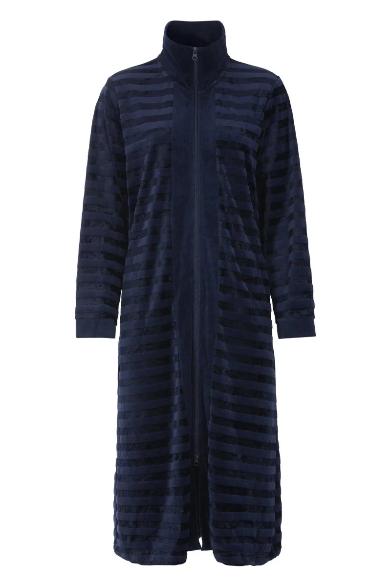 Mjuk och bekväm mysklänning eller morgonrock i mönstrad velour med krage och praktiska fickor i sidsömmarna. Utrustad med en 2-vägsdragkedja för enkel användning och justerbar ventilation. Tillverkad i en blandning av viskos och bomull, vilket ger en lättare och tunnare känsla än traditionell velour, samtidigt som den behåller en mjuk och härlig komfort.
