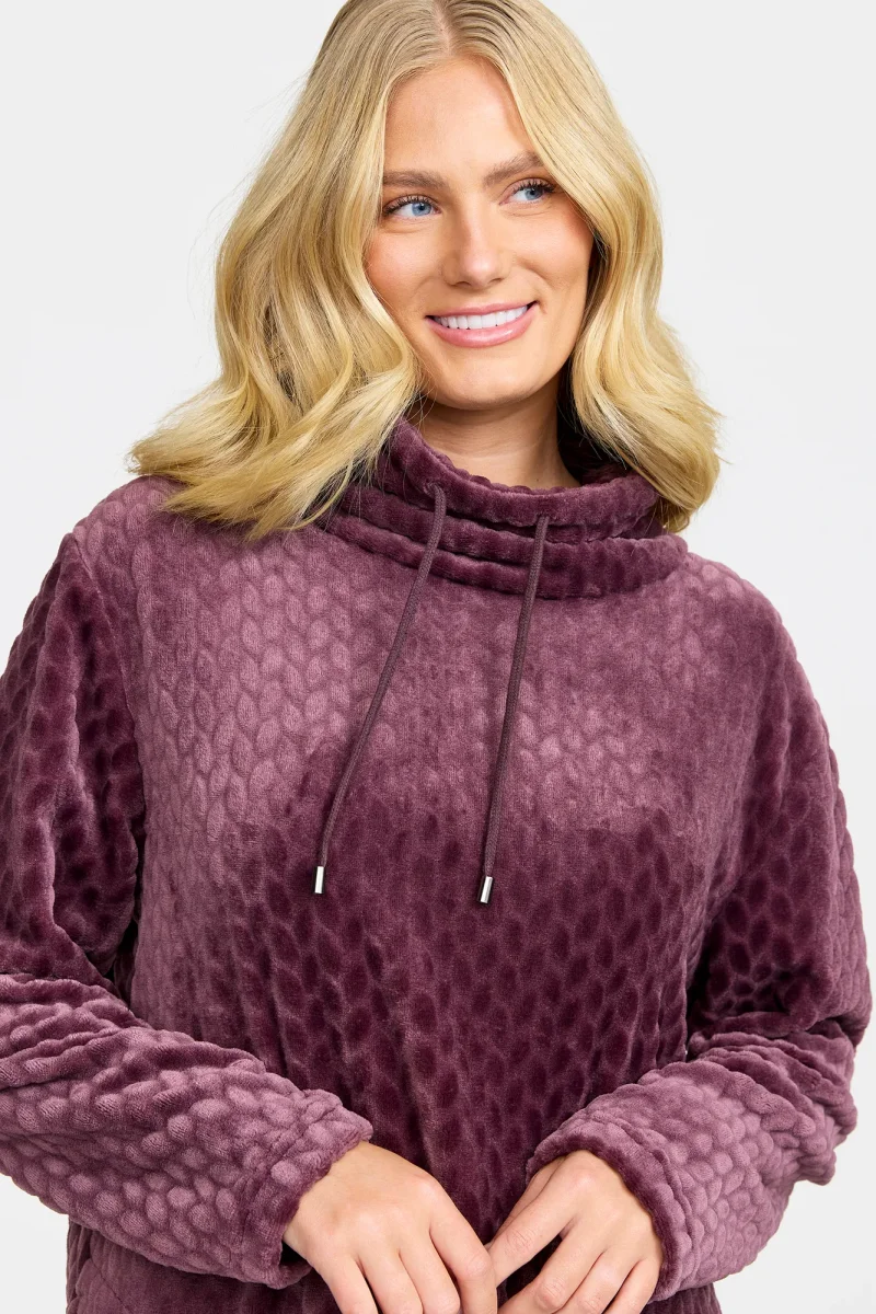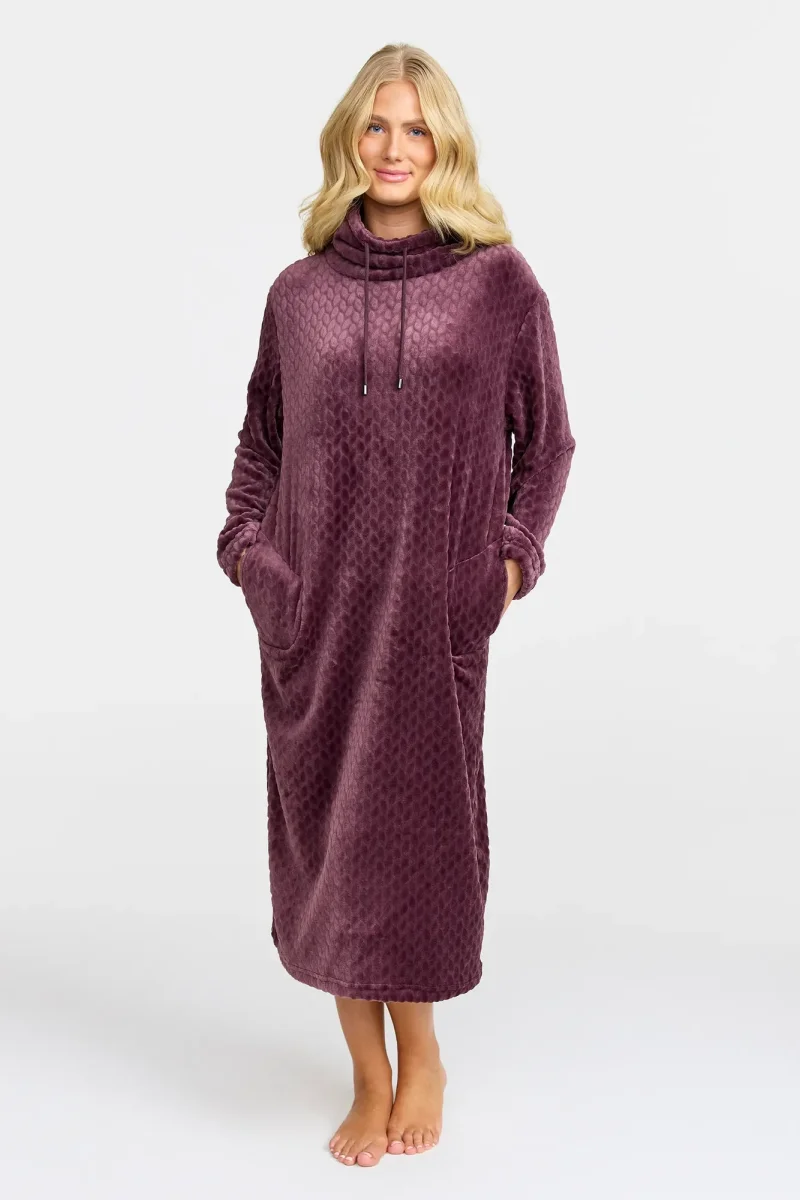Upptäck vår varma mysklänning i jacquardfleece. Med en liten högre krage och de praktiska fickor i sidsömmarna är detta det perfekta hemmaplagget. Passar perfekt för kyliga dagar eller mysstunder hemma.