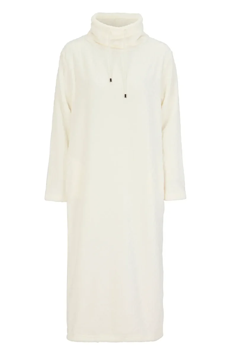 Upptäck vår varma mysklänning i jacquardfleece. Med en liten högre krage och de praktiska fickor i sidsömmarna är detta det perfekta hemmaplagget. Passar perfekt för kyliga dagar eller mysstunder hemma.