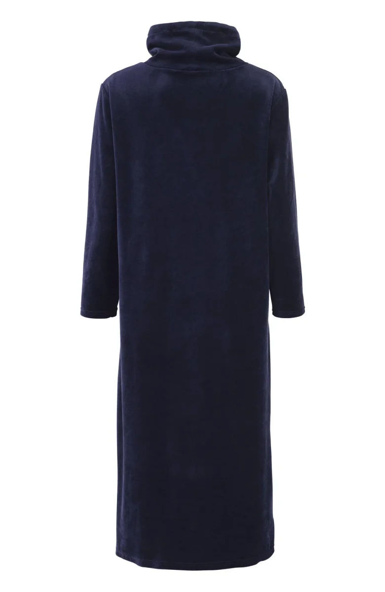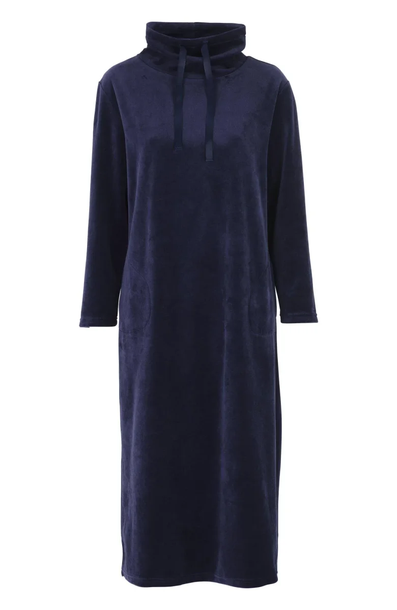 Mysklänning i enfärgad velour med krage och fickor i sidsömmarna. Velour är känt för sin mjuka och lyxiga yta som ger både komfort och stil till plagget. Perfekt för avslappnade stunder hemma med en extra touch av elegans.