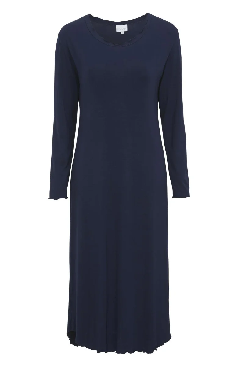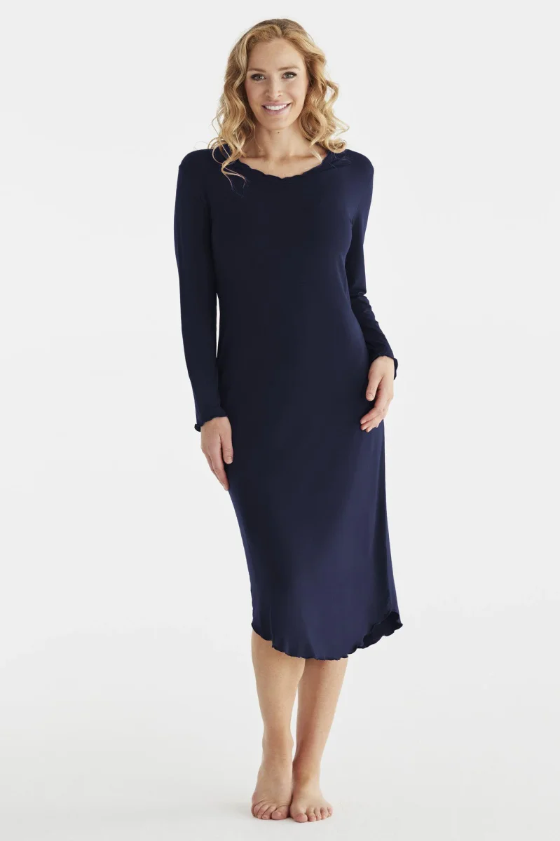 Ett stilfullt nattlinne ur vår serie Amelia, med elegant vågformad kant både vid halsringningen och längst ned. Den rundade halsen och de långa ärmarna skapar en tidlös design som kombinerar komfort och elegans. Tillverkat i mjuk bambuviskos som låter huden andas och ger en behaglig känsla hela natten det perfekta valet för en god och fridfull sömn.