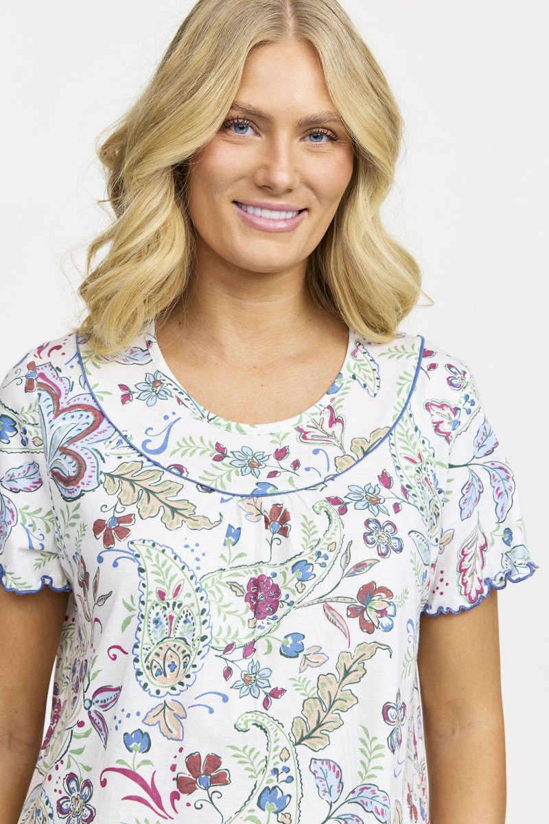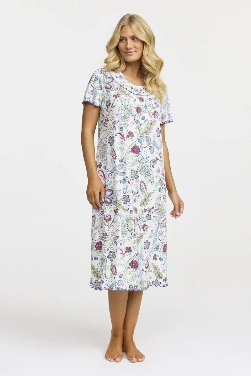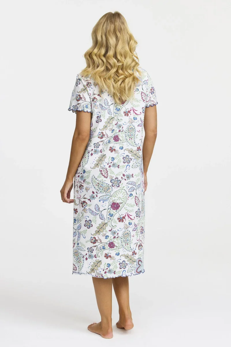 Ett kortärmat nattlinne i en längre modell, tillverkat i mjuk och behaglig bomull. Nattlinnet har rund hals och dekorativa rynkor framtill som ger en feminin och avslappnad siluett. Perfekt för en skön och luftig nattsömn.