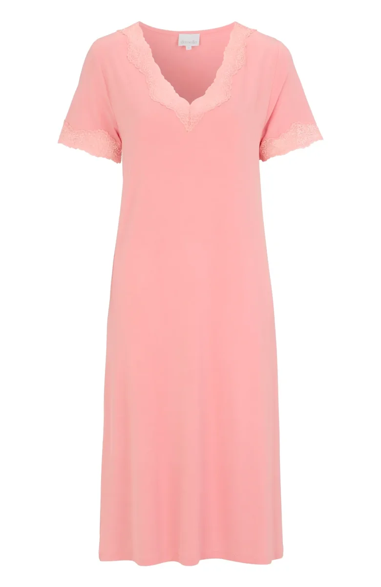 Nattlinne i bambuviskos med spets vid halsringning och ärmslut. Med sina korta ärmar kombinerar detta nattlinne komfort och stil. Bambuviskosmaterialet ger en lyxig mjukhet mot huden.