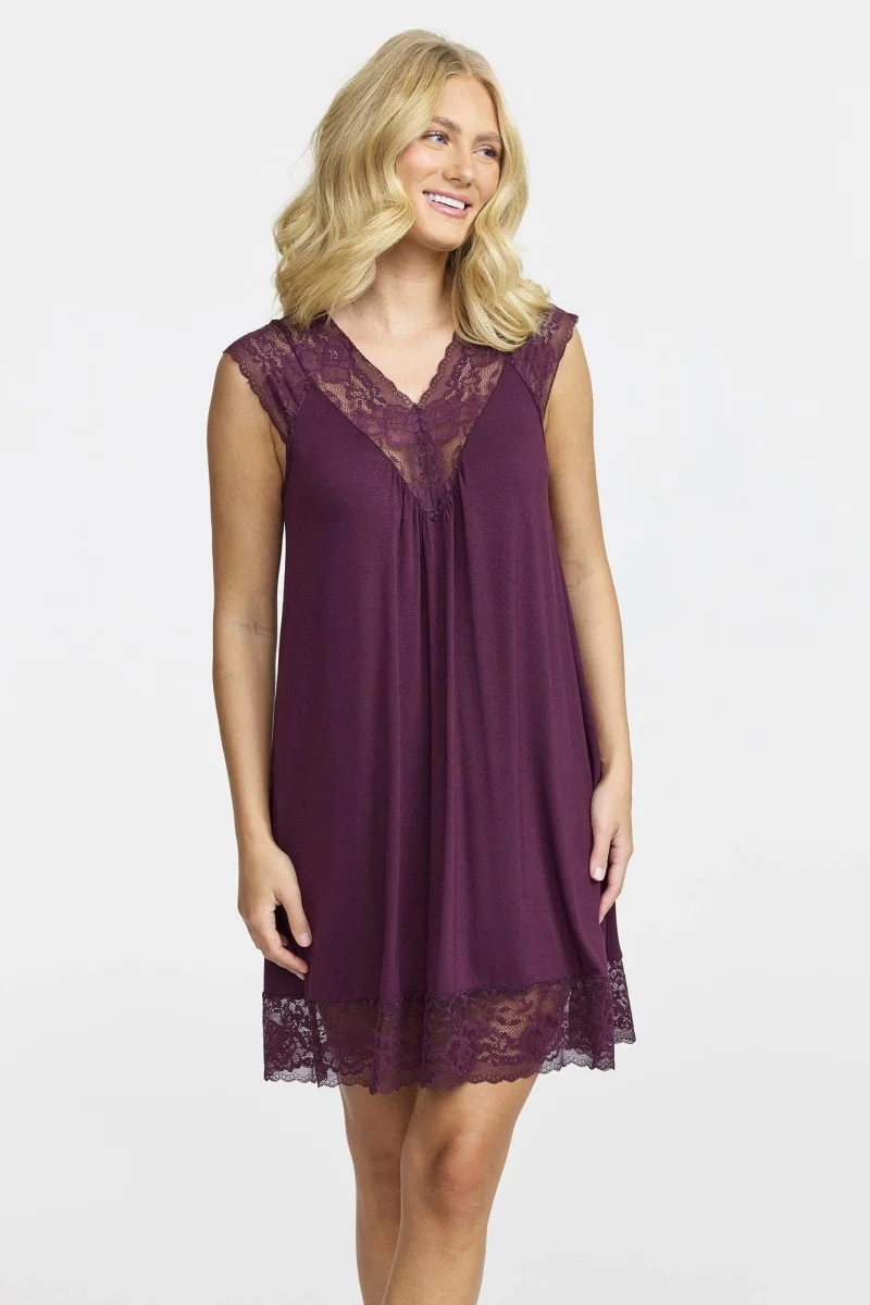 Vårt ärmfria nattlinne har en elegant V-formad spetsdetalj vid halsen, samt en spets vid fållen. Viskos materialet ger en följsam passform som skapar en perfekt balans mellan elegans och bekvämlighet.