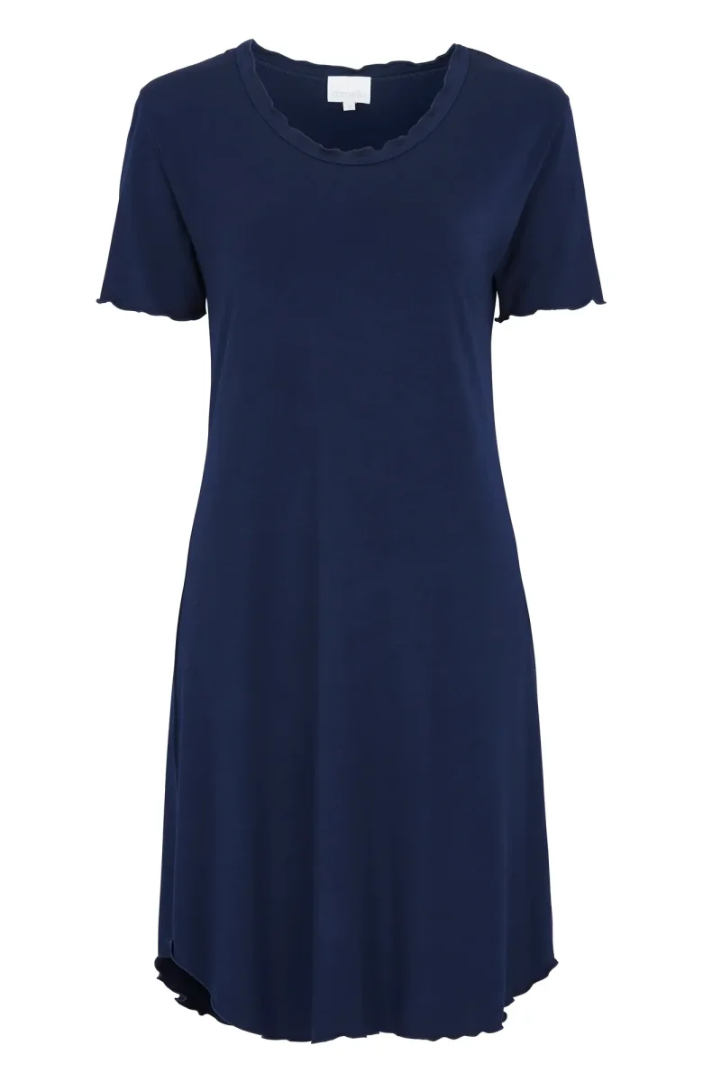 Ett nattlinne i bambuviskos med en elegant vågformad kant vid halsen och längst ned. Med sin rundade hals och korta ärmar är detta nattlinne både bekvämt och stilfullt. Tillverkat i bambu för en mjuk och skön känsla, vilket gör det till det perfekta valet för en fridfull natt.
