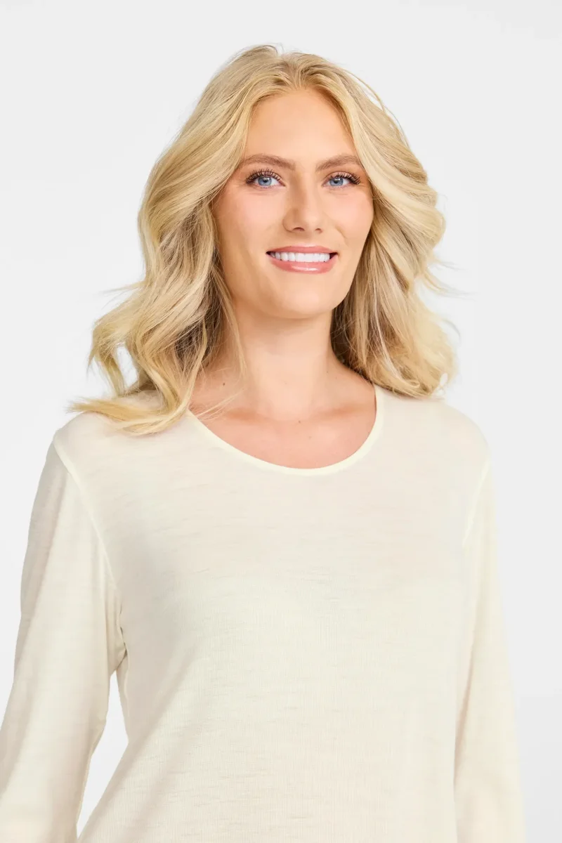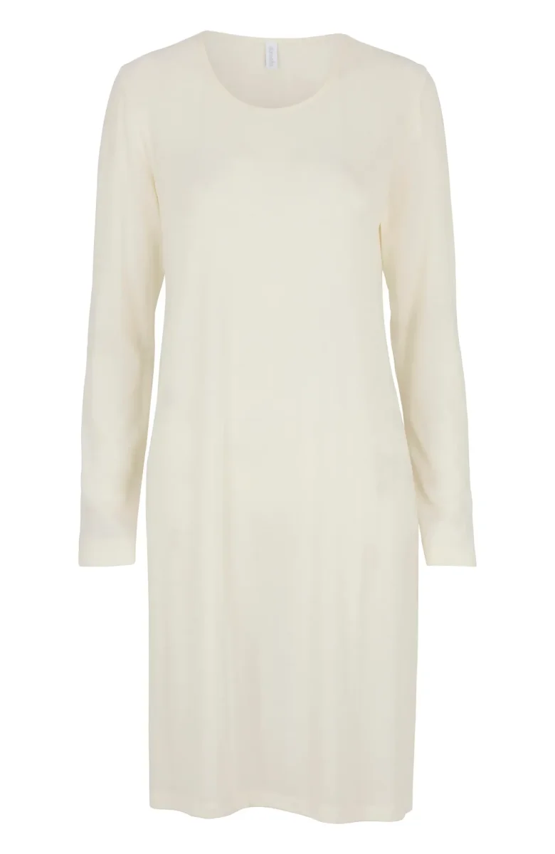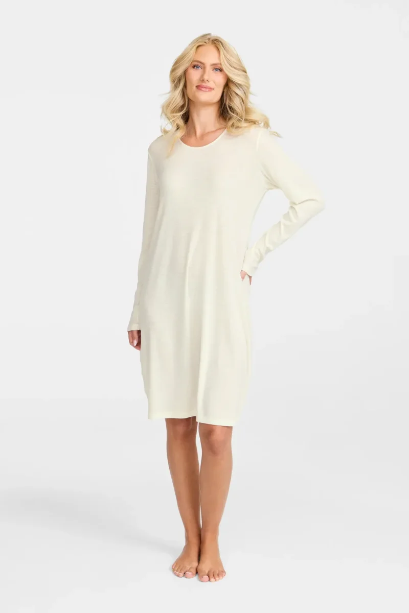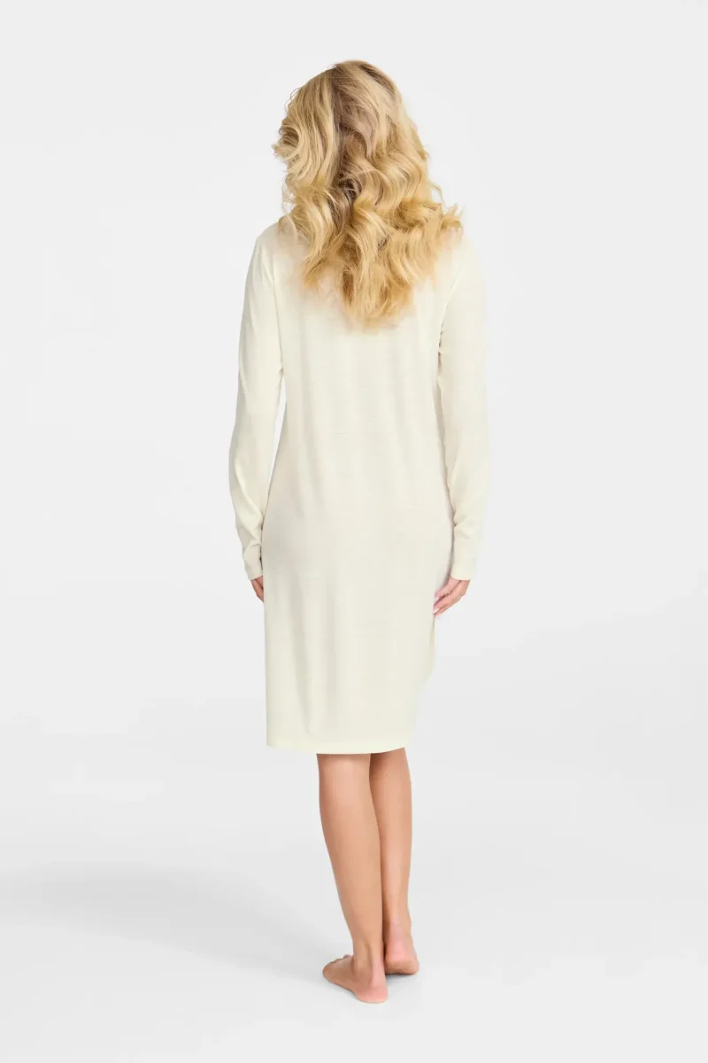 Långärmat nattlinne tillverkat av högkvalitativ, mulesingfri merinoull. Den runda halsringningen och den mjuka ullkvaliteten ger en behaglig känsla mot huden, samtidigt som materialet håller dig varm under kyliga nätter. Med sin långärmade design ger nattlinnet extra täckning och komfort för en god natts sömn.