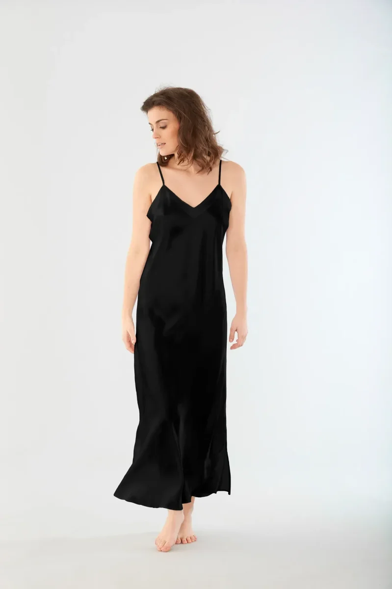 Elegant nattlinne i vävt siden med justerbara axelband för en skräddarsydd passform. Perfekt för en stilfull och bekväm natt.