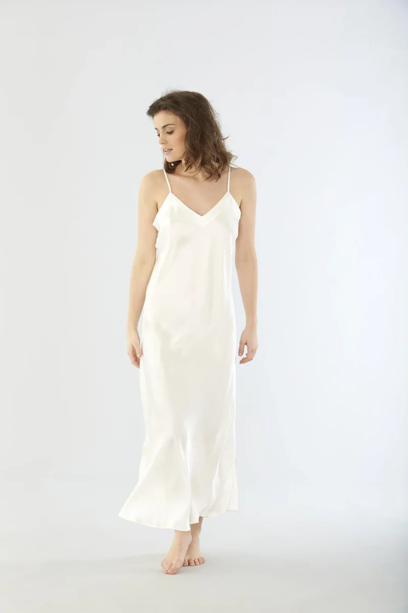 Elegant nattlinne i vävt siden med justerbara axelband för en skräddarsydd passform. Perfekt för en stilfull och bekväm natt.