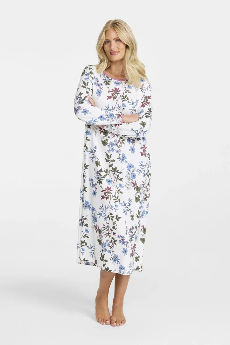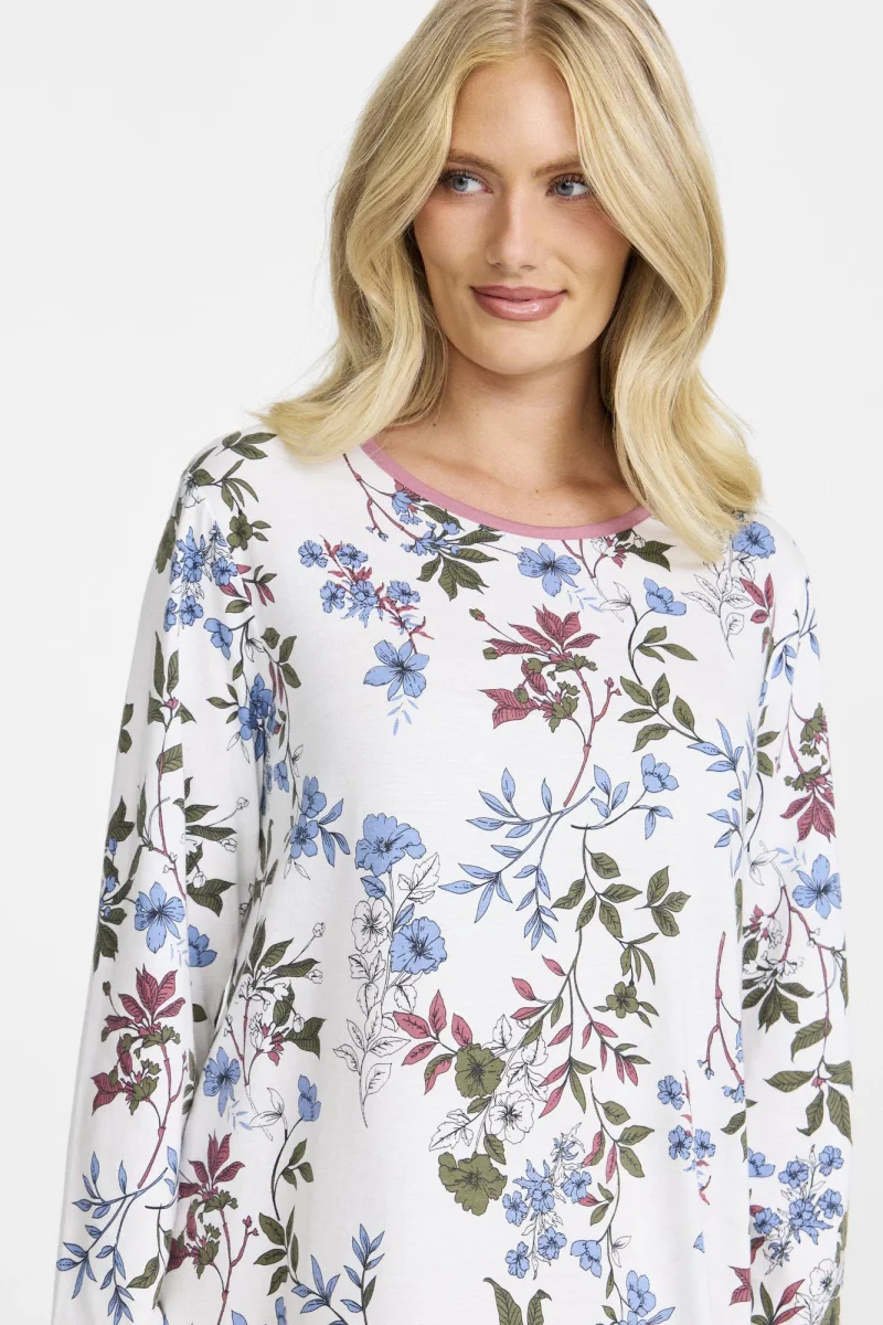 Mjuk och skön långärmad nattlinne med rund hals, tillverkad i en härlig blandning av bomull och modal, ett naturligt material som känns silkeslent mot huden. Nattlinnet har ett vackert mönster och eleganta enfärgade detaljer vid halsringning och ärmslut, som ger en stilren och harmonisk känsla. Perfekt för både varma och kyliga nätter, och skapar en mjuk och behaglig känsla under hela natten.