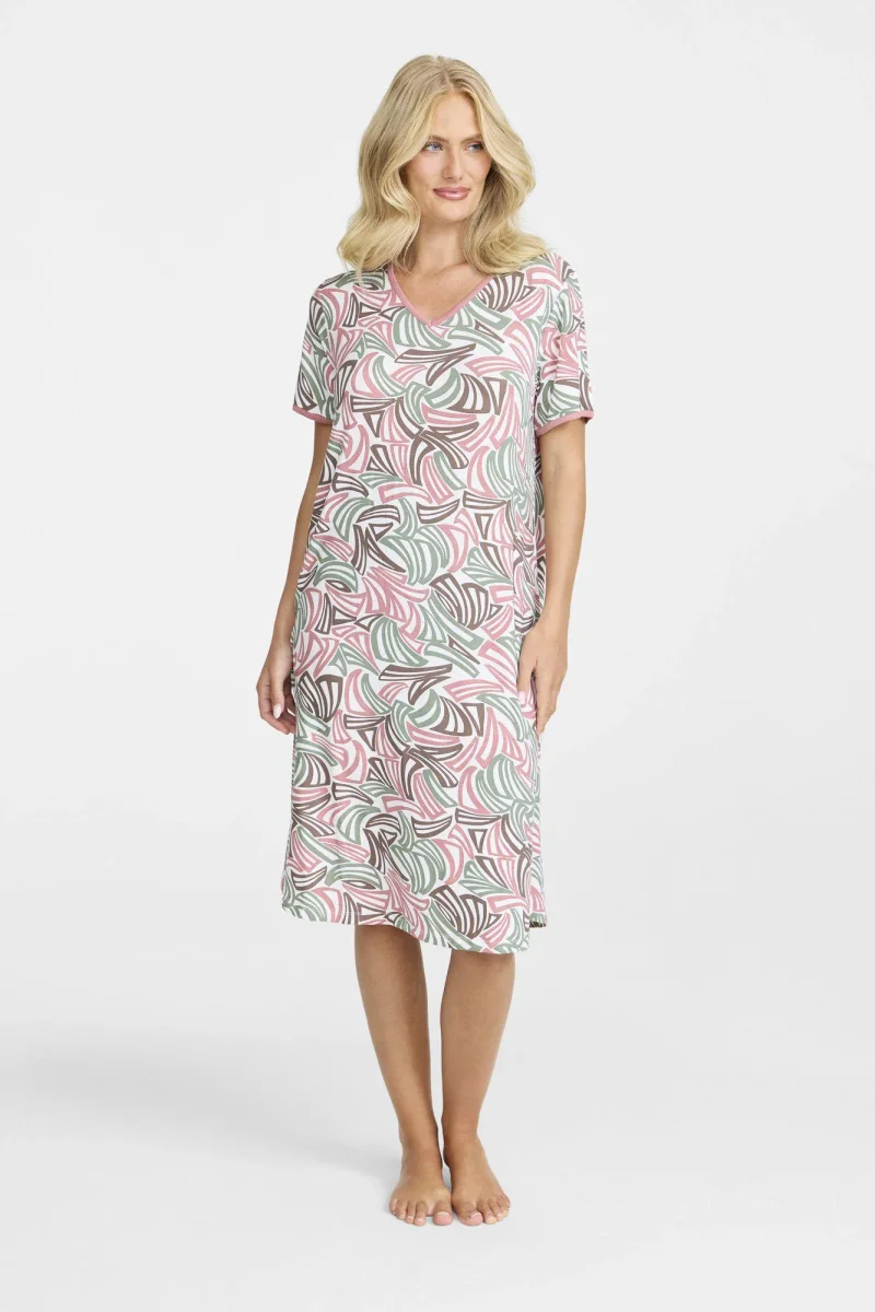 Mjuk och skön kortärmad nattklänning med V-ringad hals, tillverkad i mönstrad bambuviskos med tryck, ett naturligt och hållbart material som känns silkeslent mot huden. Perfekt för både varma och kyliga nätter tack vare materialets andningsförmåga och mjuka komfort. Stilfull, bekväm och lätt nattlinnet som gör natten ännu mer njutbar.