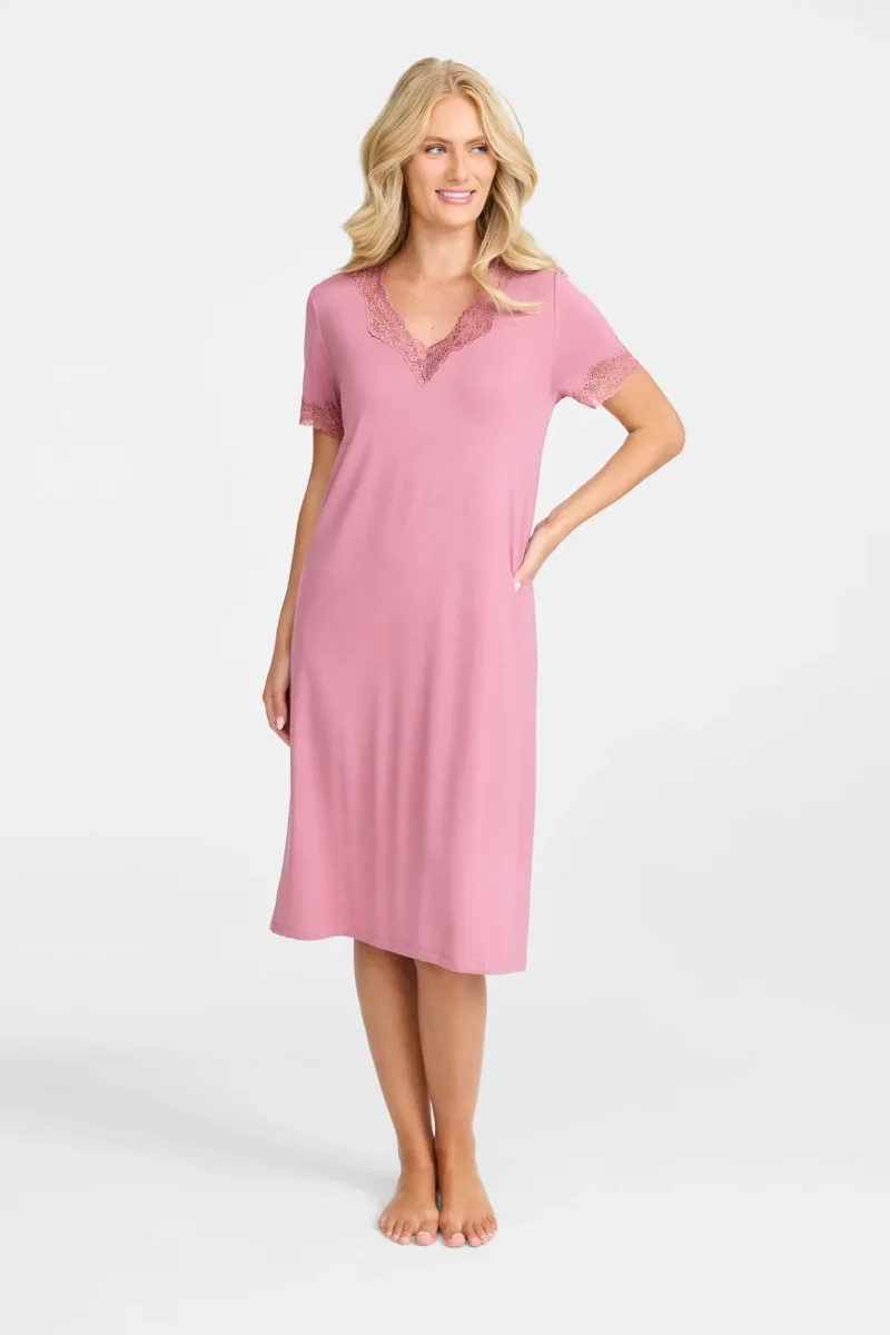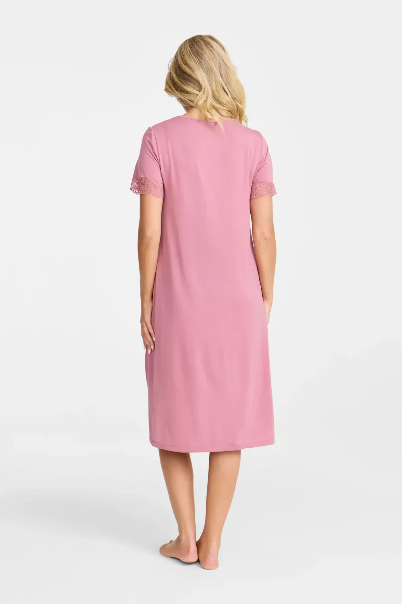 Nattlinne i bambuviskos med spets vid halsringning och ärmslut. Med sina korta ärmar kombinerar detta nattlinne komfort och stil. Bambuviskosmaterialet ger en lyxig mjukhet mot huden.