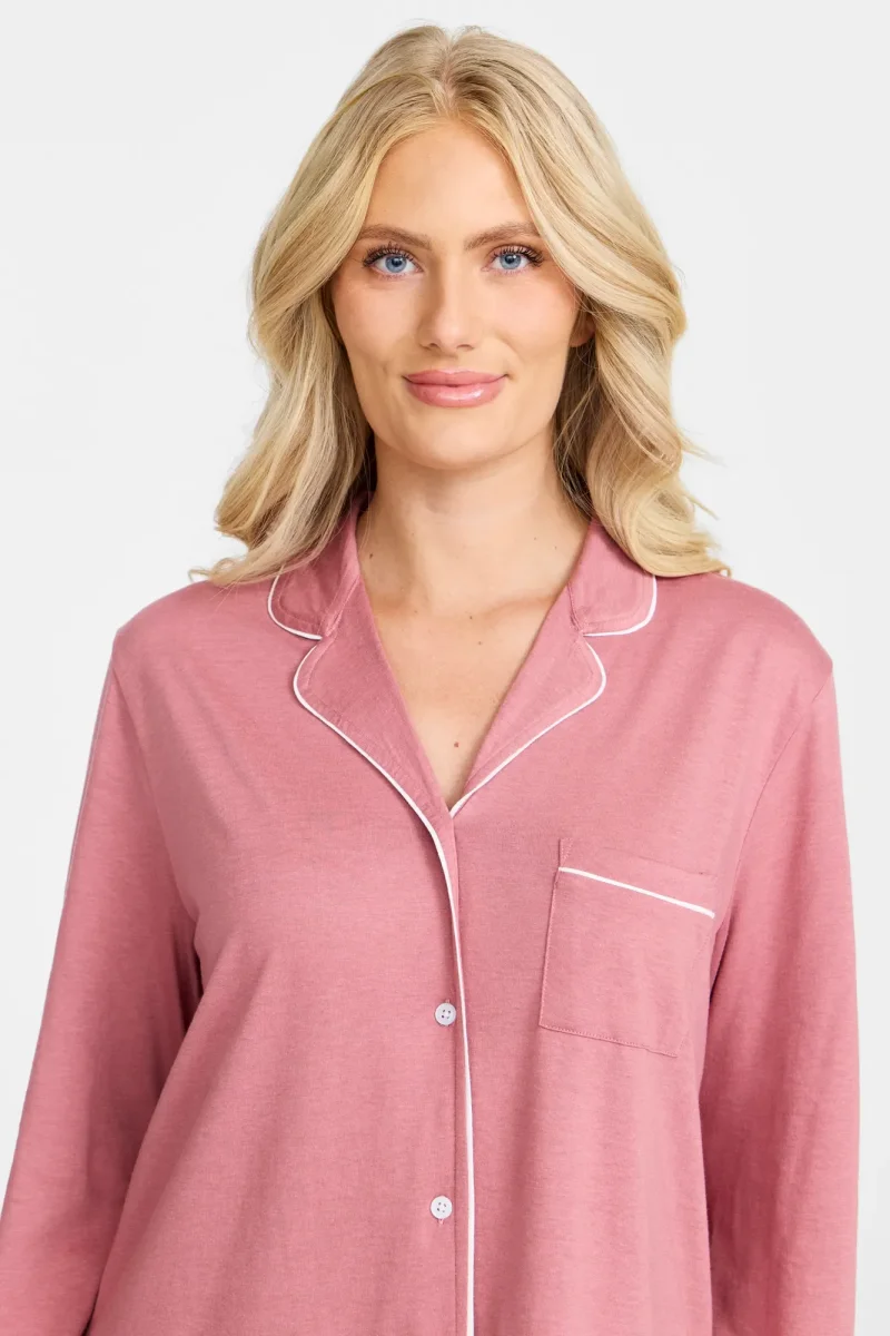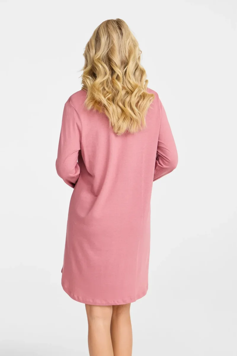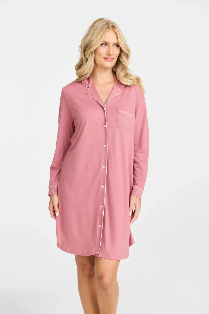 Mjuk och skön nattskjorta i en blandning av bomull och modaljersey, ett naturligt material som känns silkeslent mot huden. Skjortan har krage, knappar och lång ärm, med eleganta vita bandkanter som ger en stilren detalj. En praktisk ficka på ena bröstet och en modern, trendig design gör detta nattplagg både funktionellt och snyggt.
