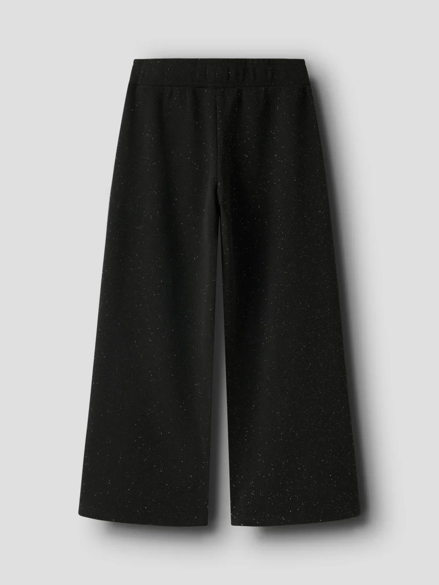 Glittrig byxa med vida ben. Fickor i sidan och ställbar midja.