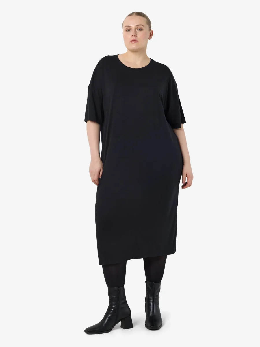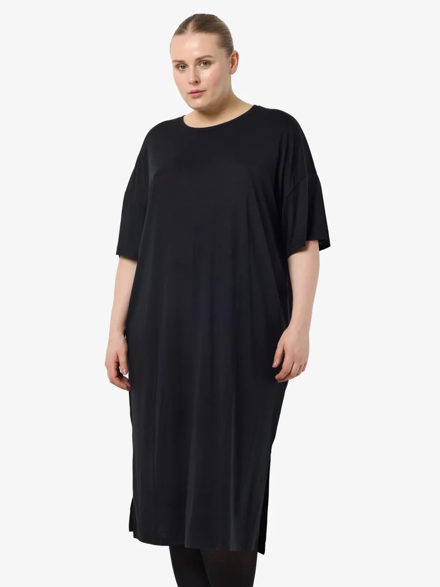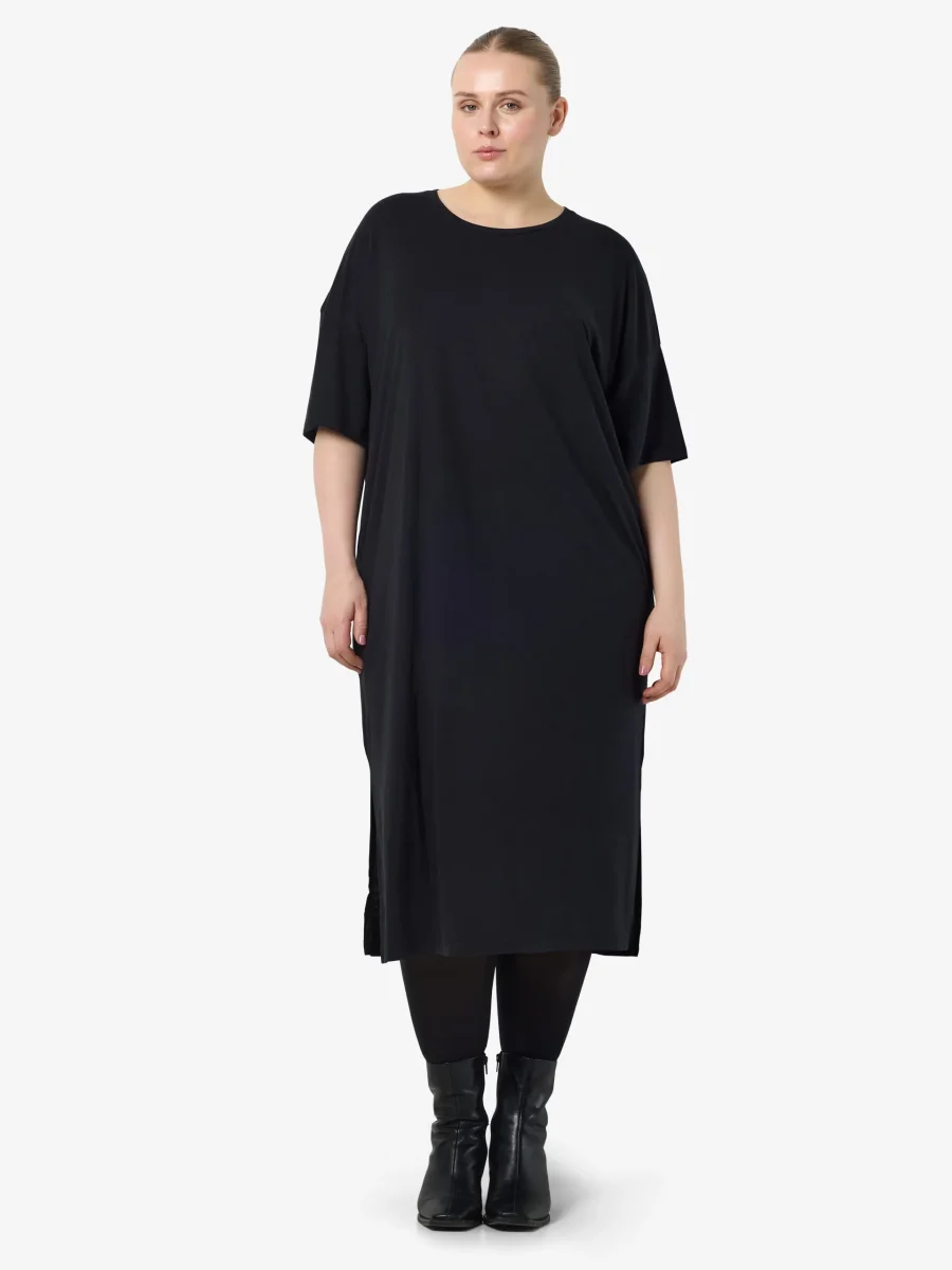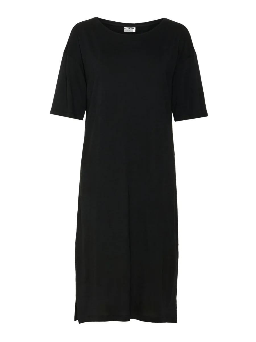 Mjuk vadlång klänning med 2/4 ärm, rund hals och slits nertill. Färg: Svart Material: 65% Polyester, 35% Viskos