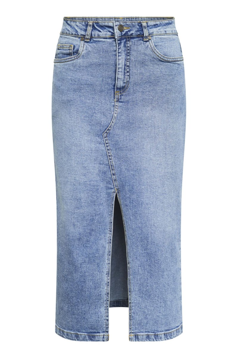 En vadlång jeanskjol med en tight passform. Rak modell med slits baktill.