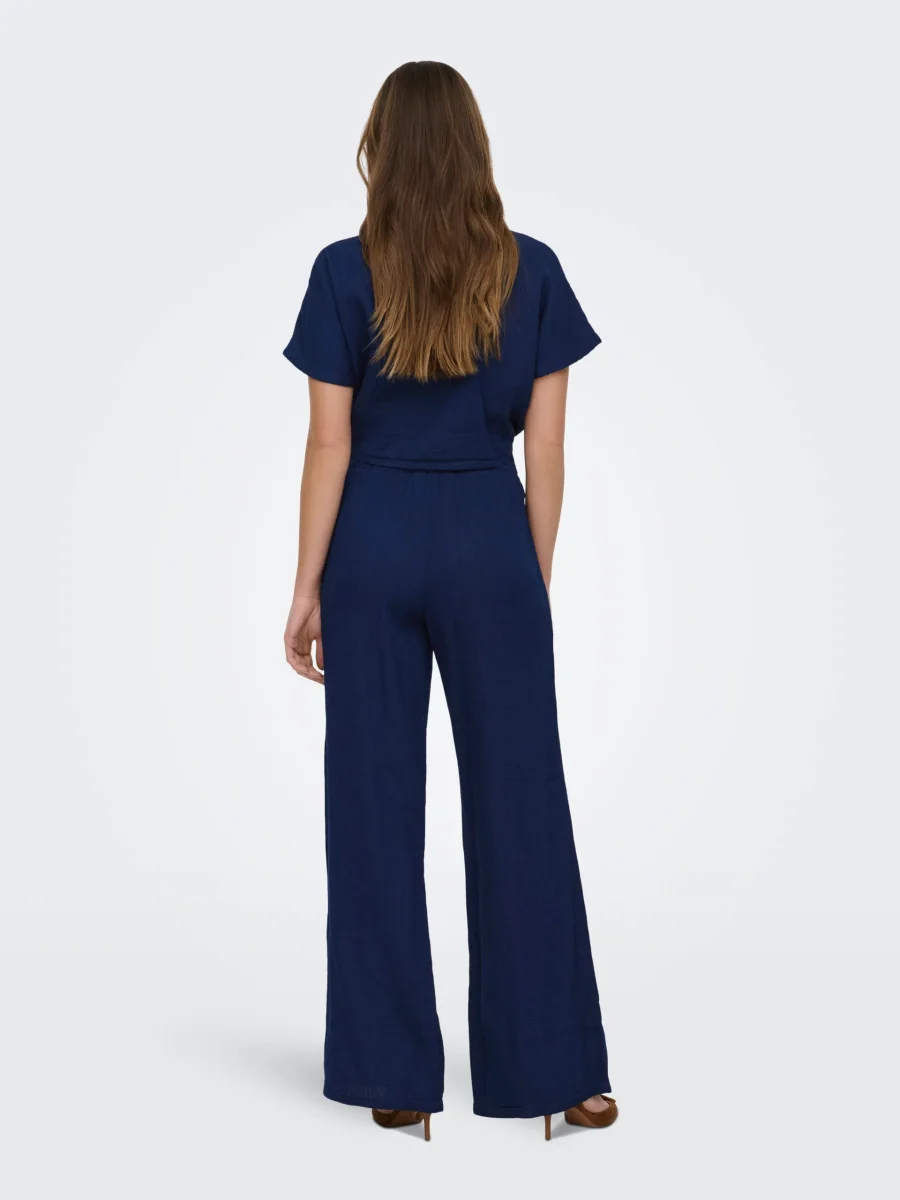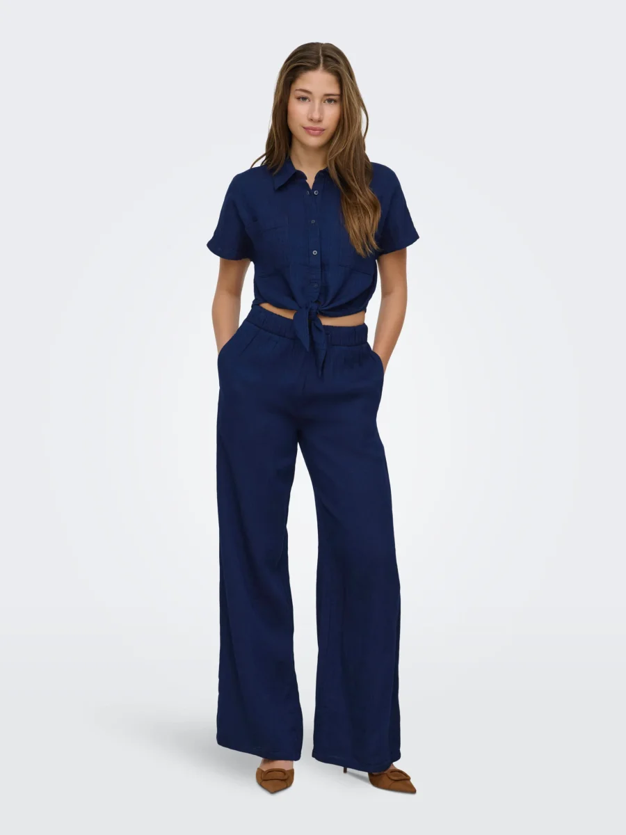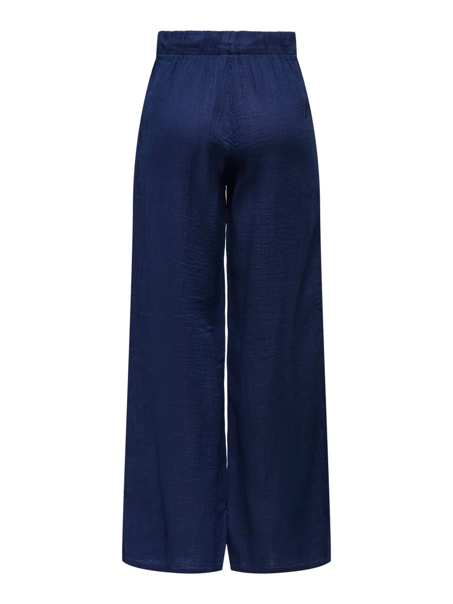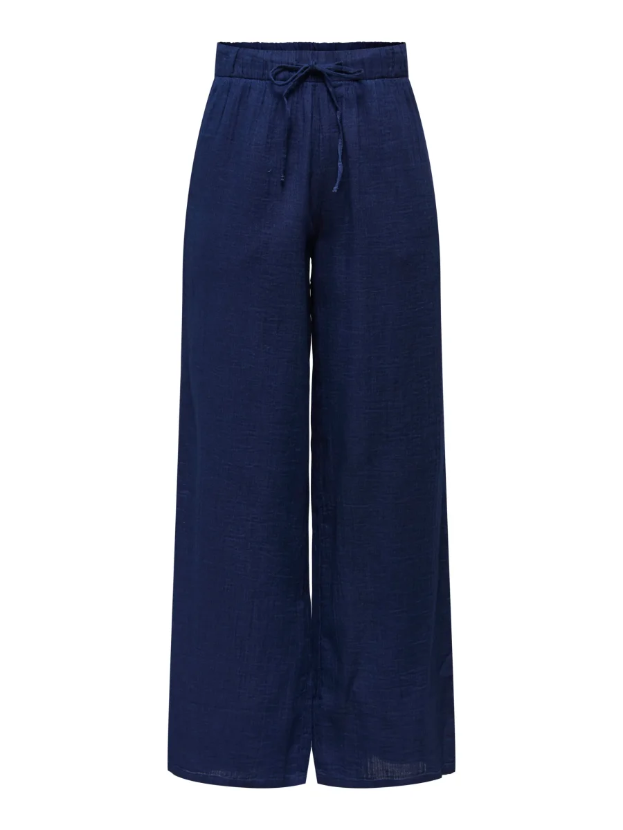 Skön byxa med vida ben, fickor i sidan, resår och knyt i midjan.
