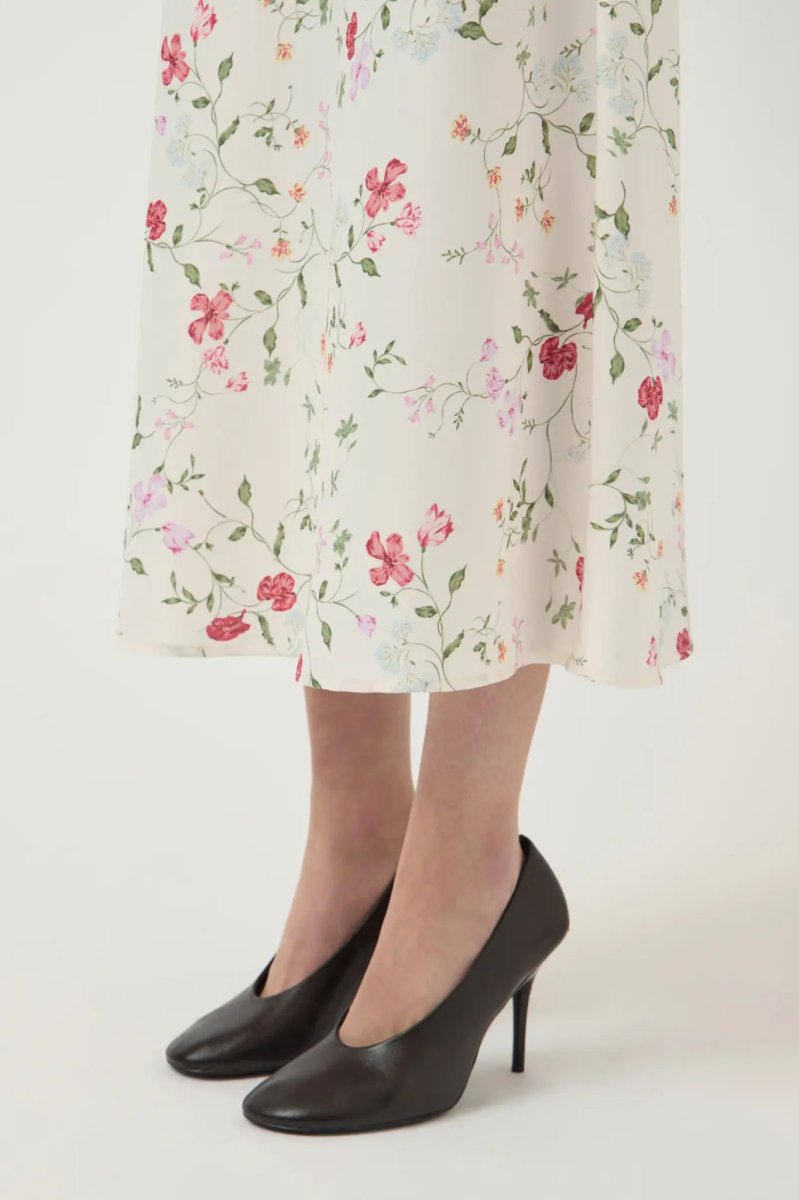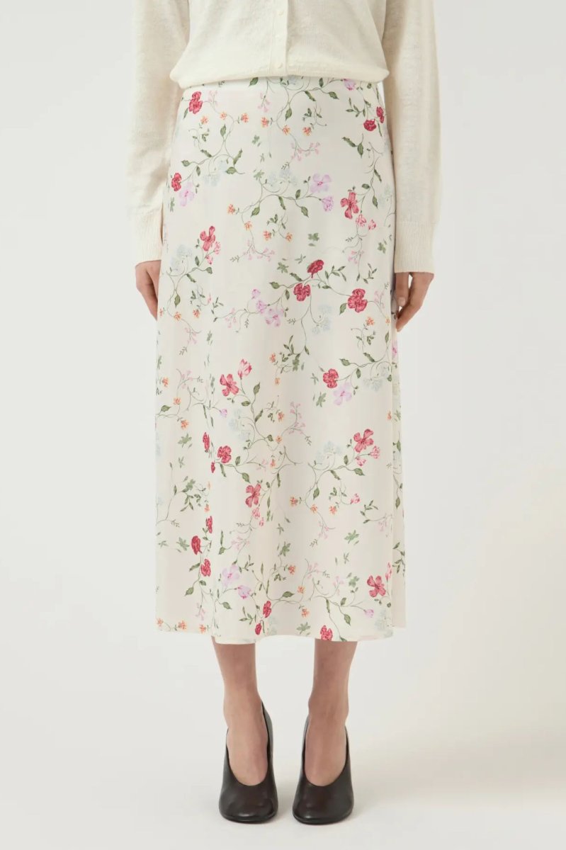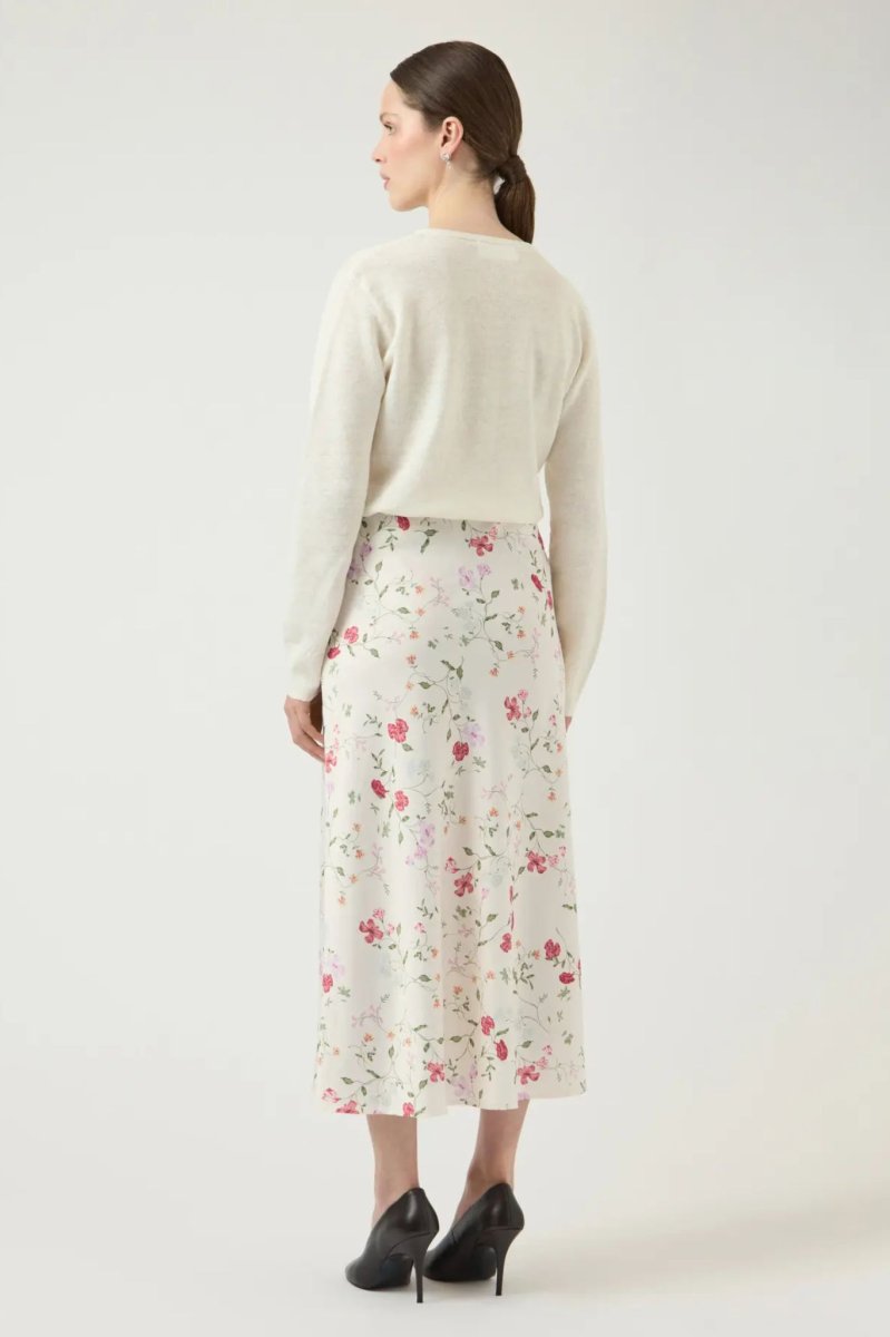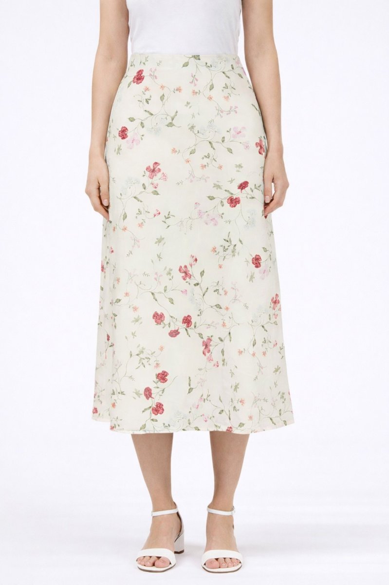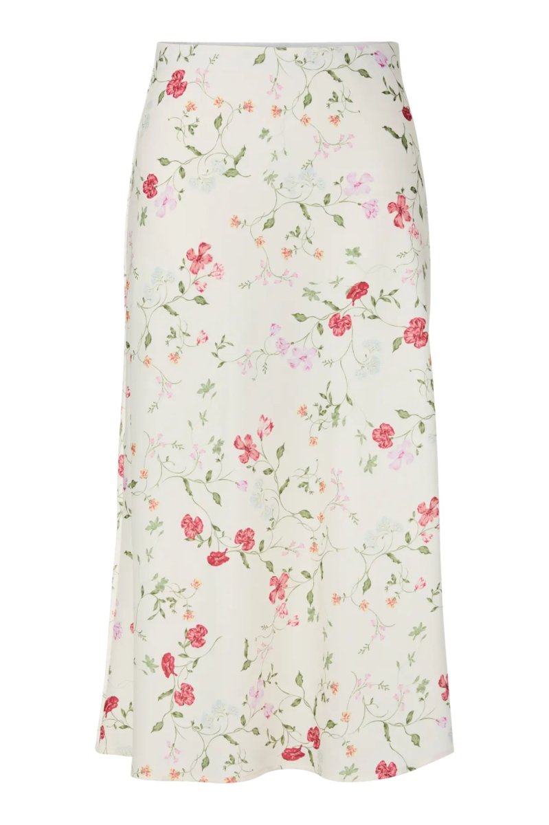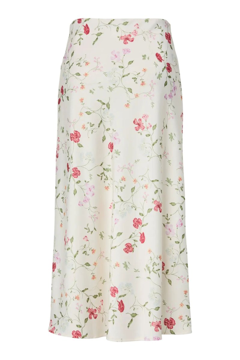 Vadlång satinkjol med hög, elastisk midja och lätt utställd siluett.