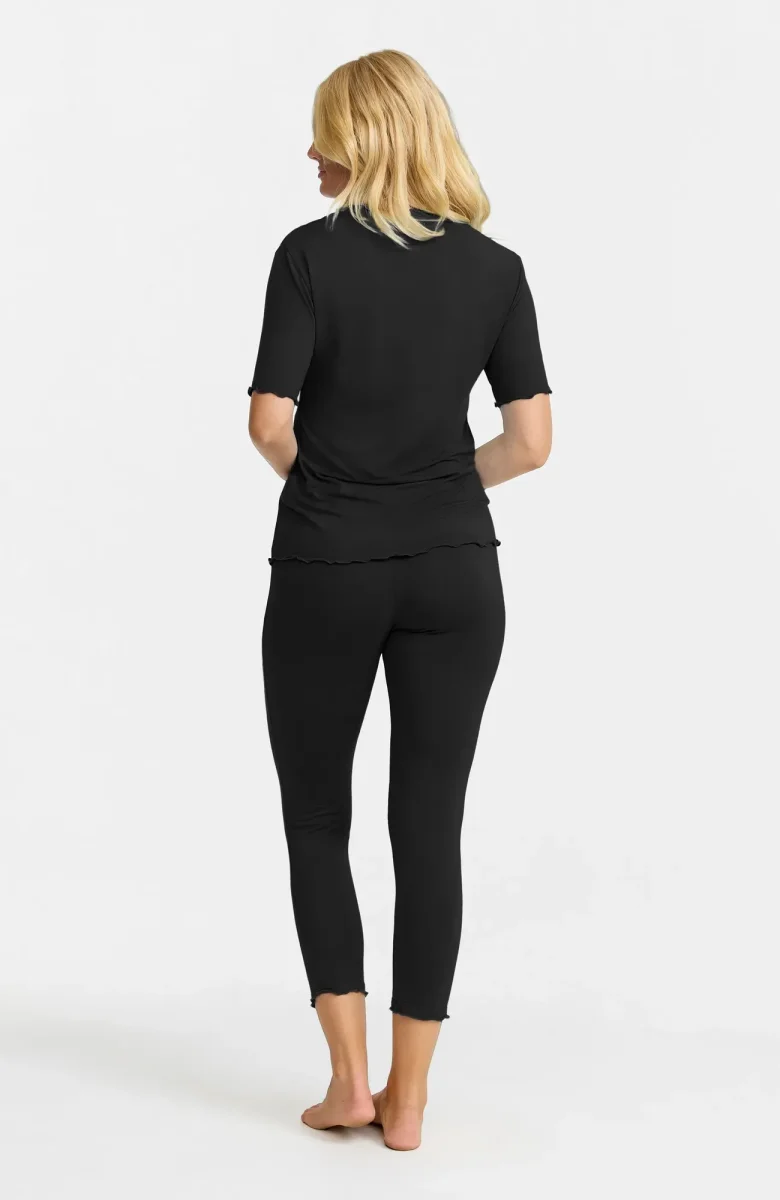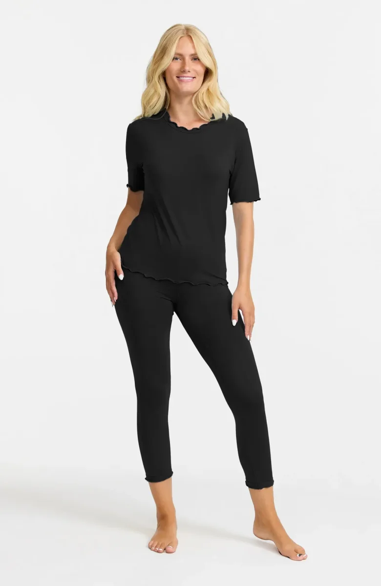 Pyjamas med topp och byxa i caprilängd. Toppen har vågformade kanter vid hals och ärm. Byxorna har resår i midjan samt vågformad kant nedtill.