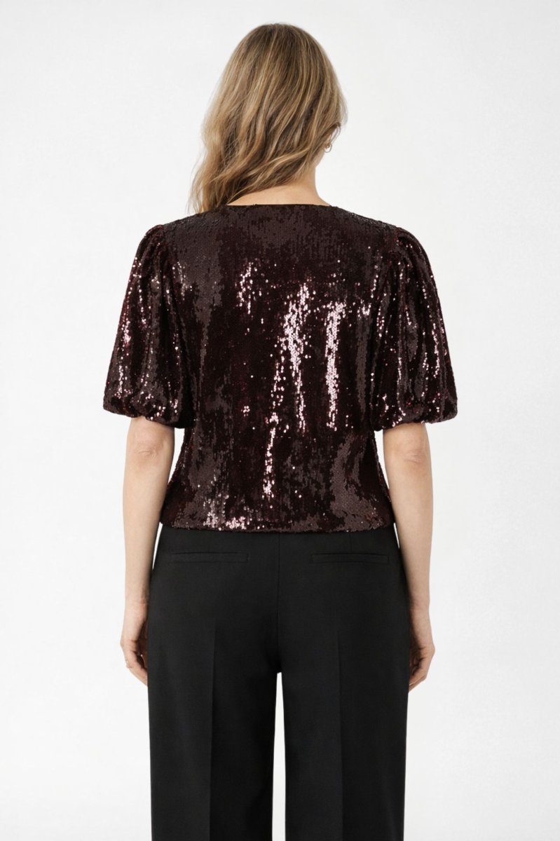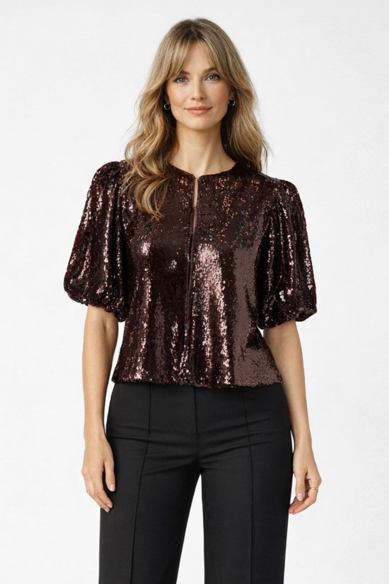 En glittrig paljettblus med rund hals, 2/4-ärmar och knäppning fram.